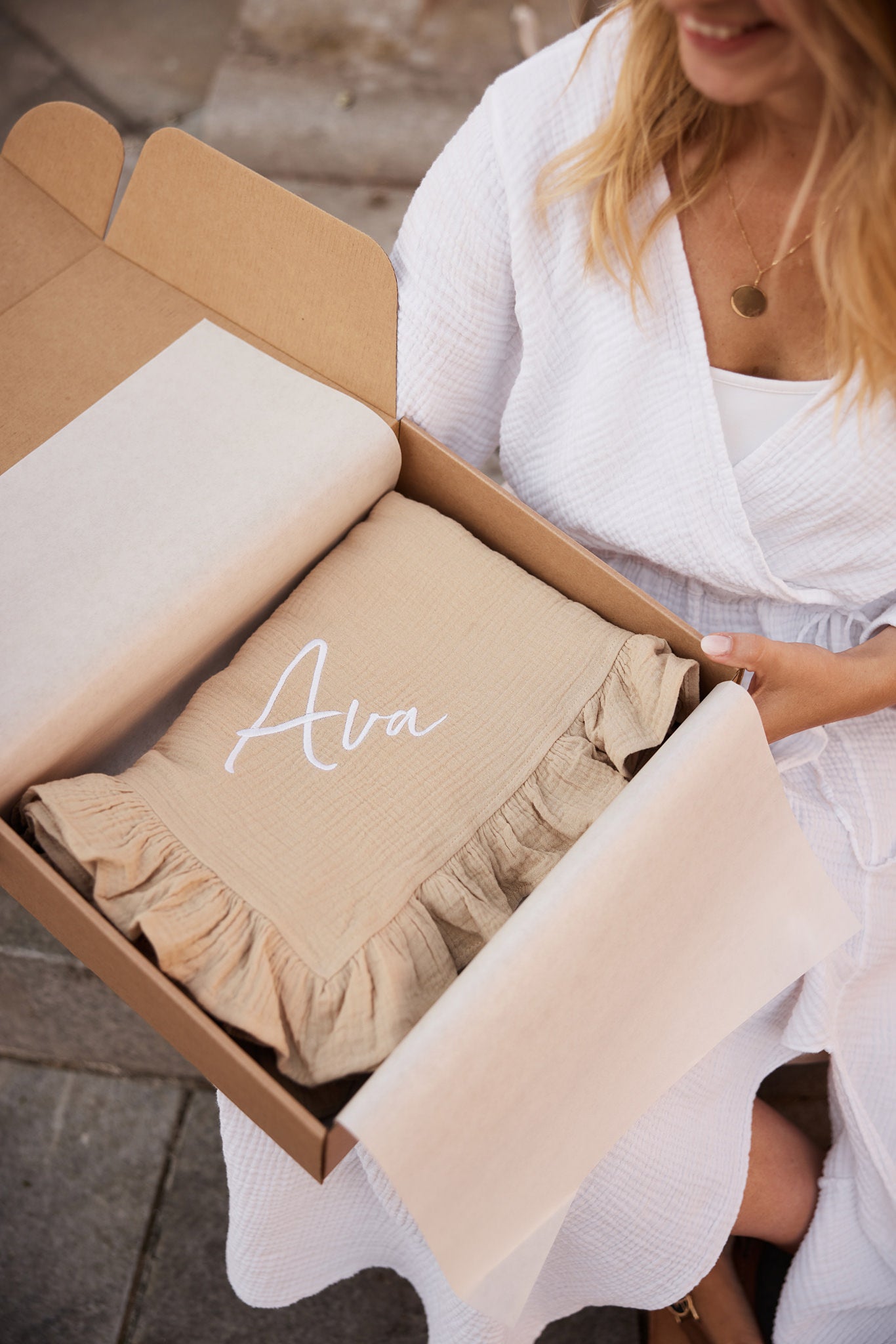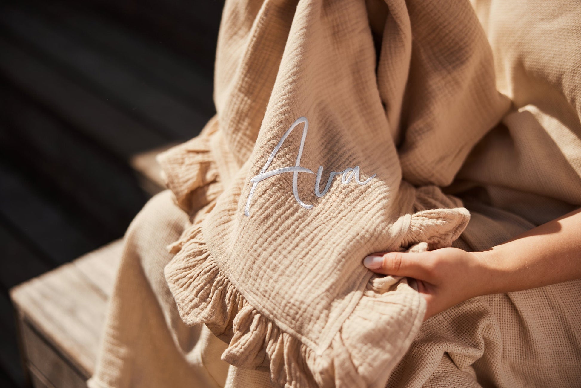 Našli ste ga. Tukaj je naša bež bombažna odejica z volančki, primerna tako za dečke in deklice. Ime otroka izvezemo v beli barvi.