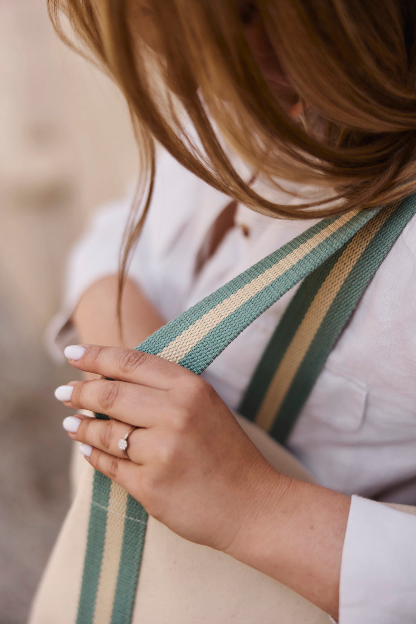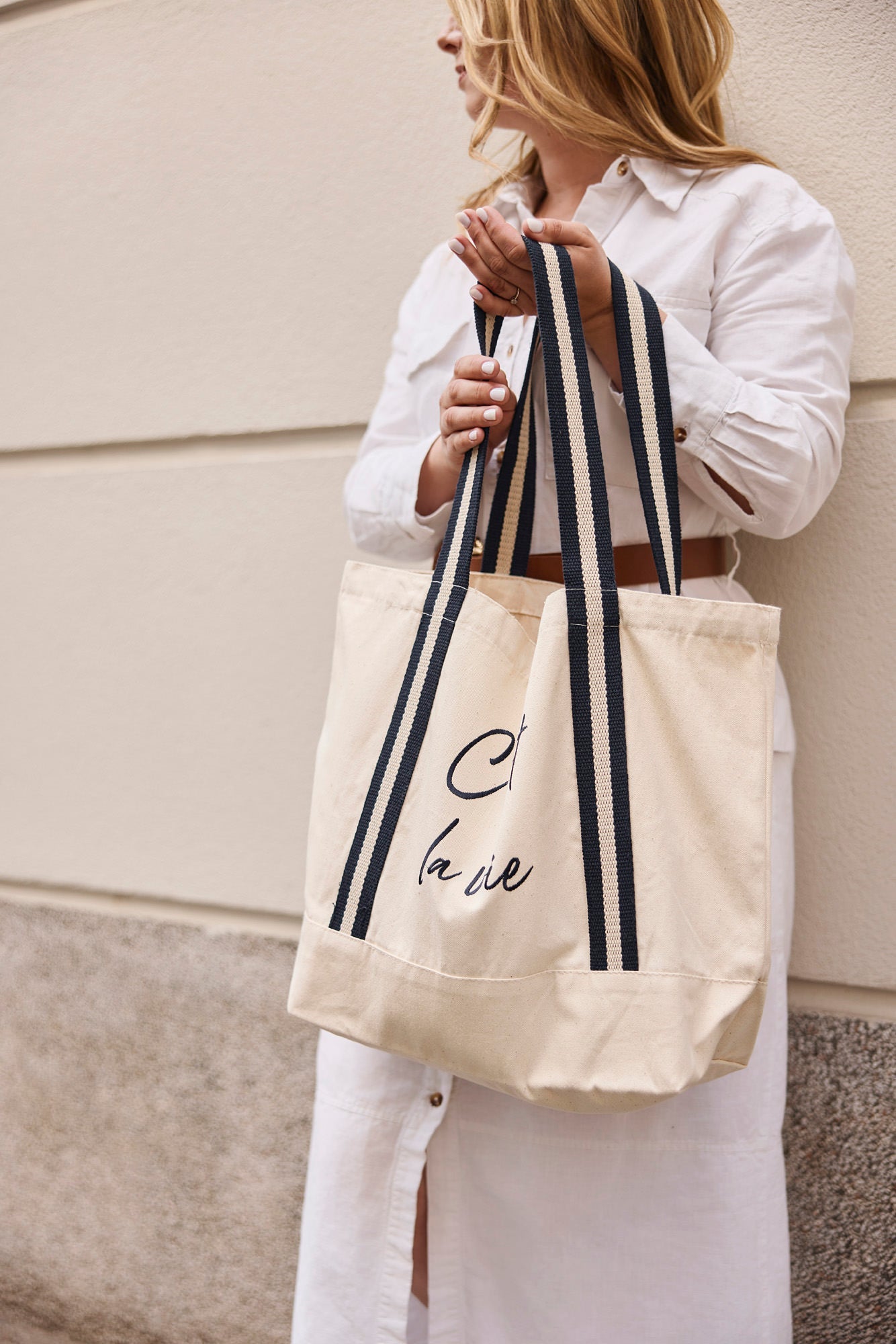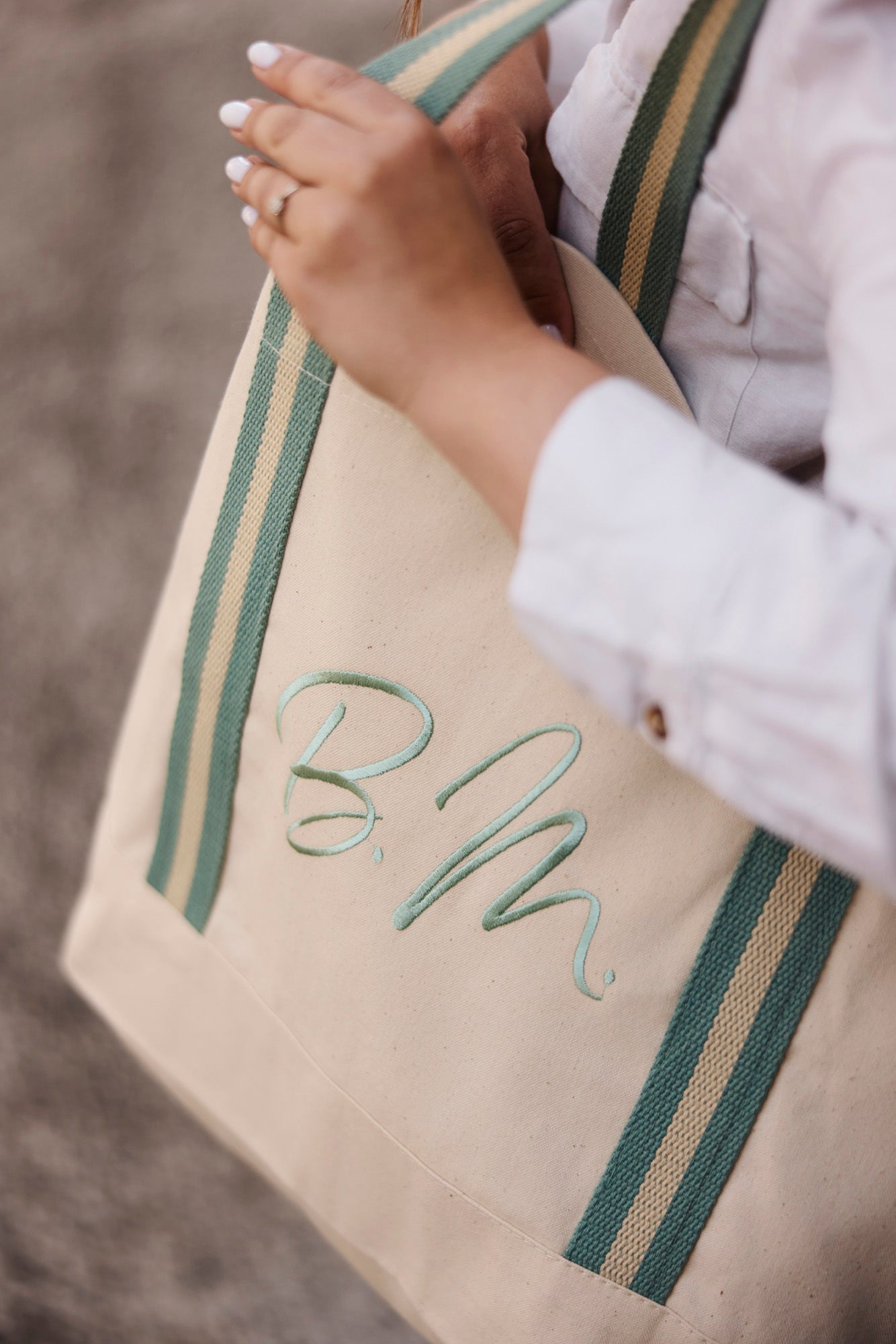 Dopolnite vaše poletne outfite s trendovsko bombažno torbo z ročajem iz blaga, na katero izvezemo vaše ime ali inicialke.