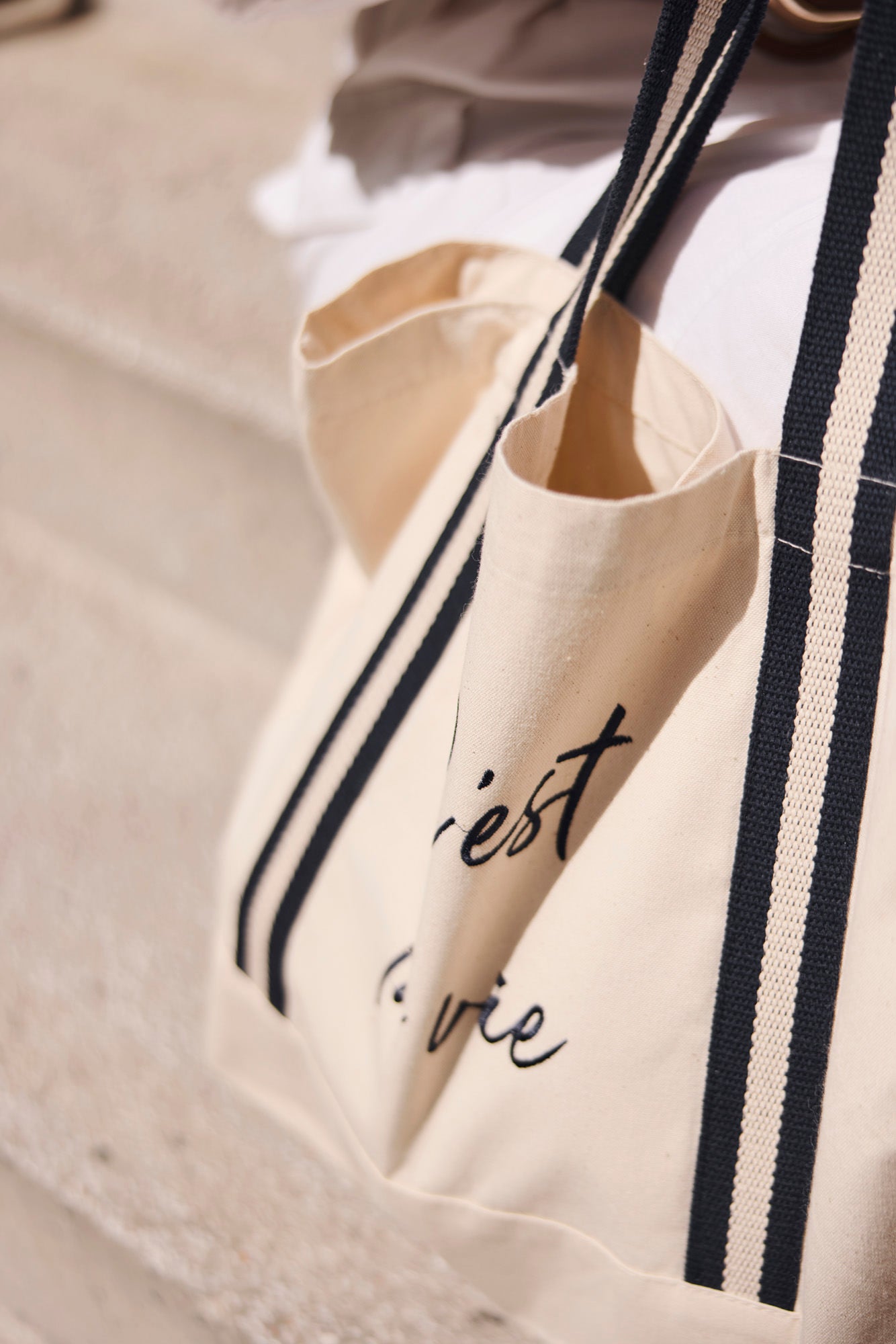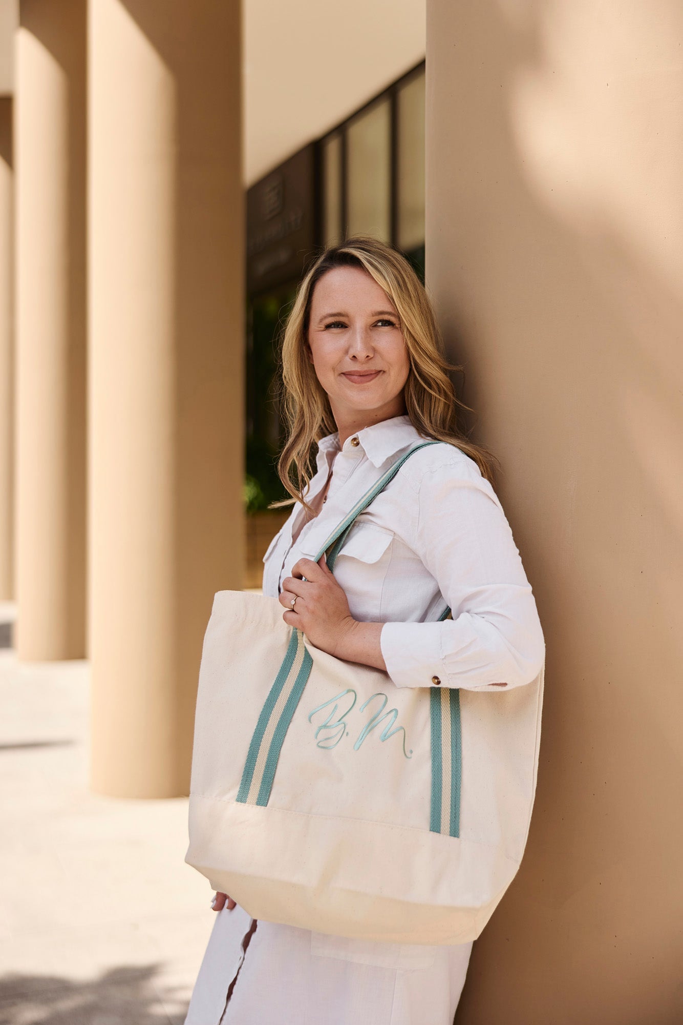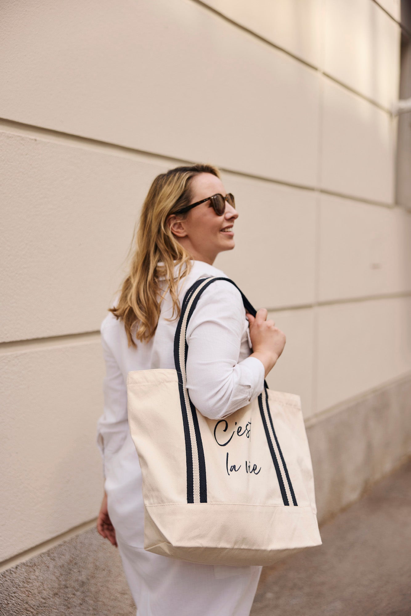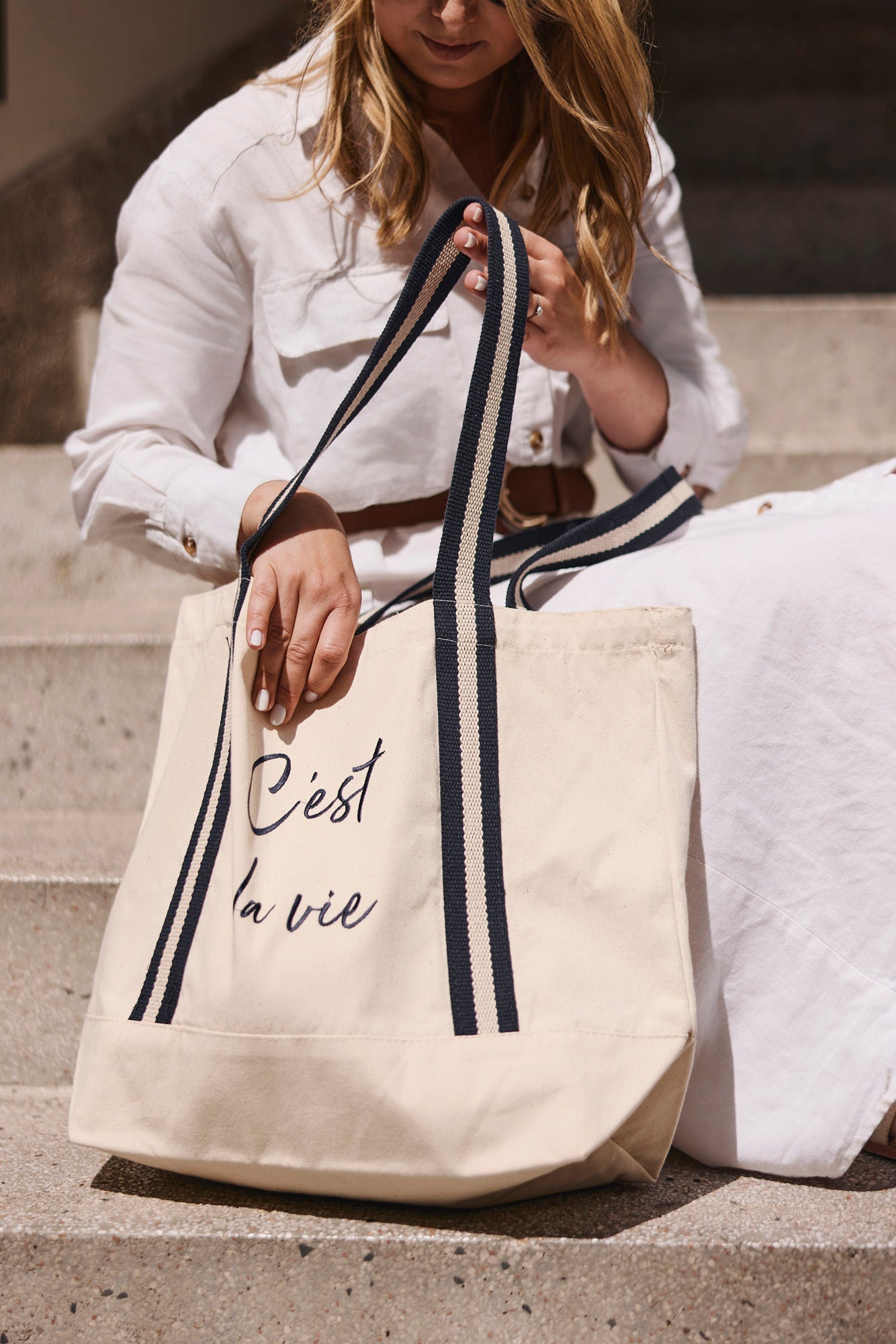 Dopolnite vaše poletne outfite s trendovsko bombažno torbo z ročajem iz blaga, na katero izvezemo vaše ime ali inicialke.