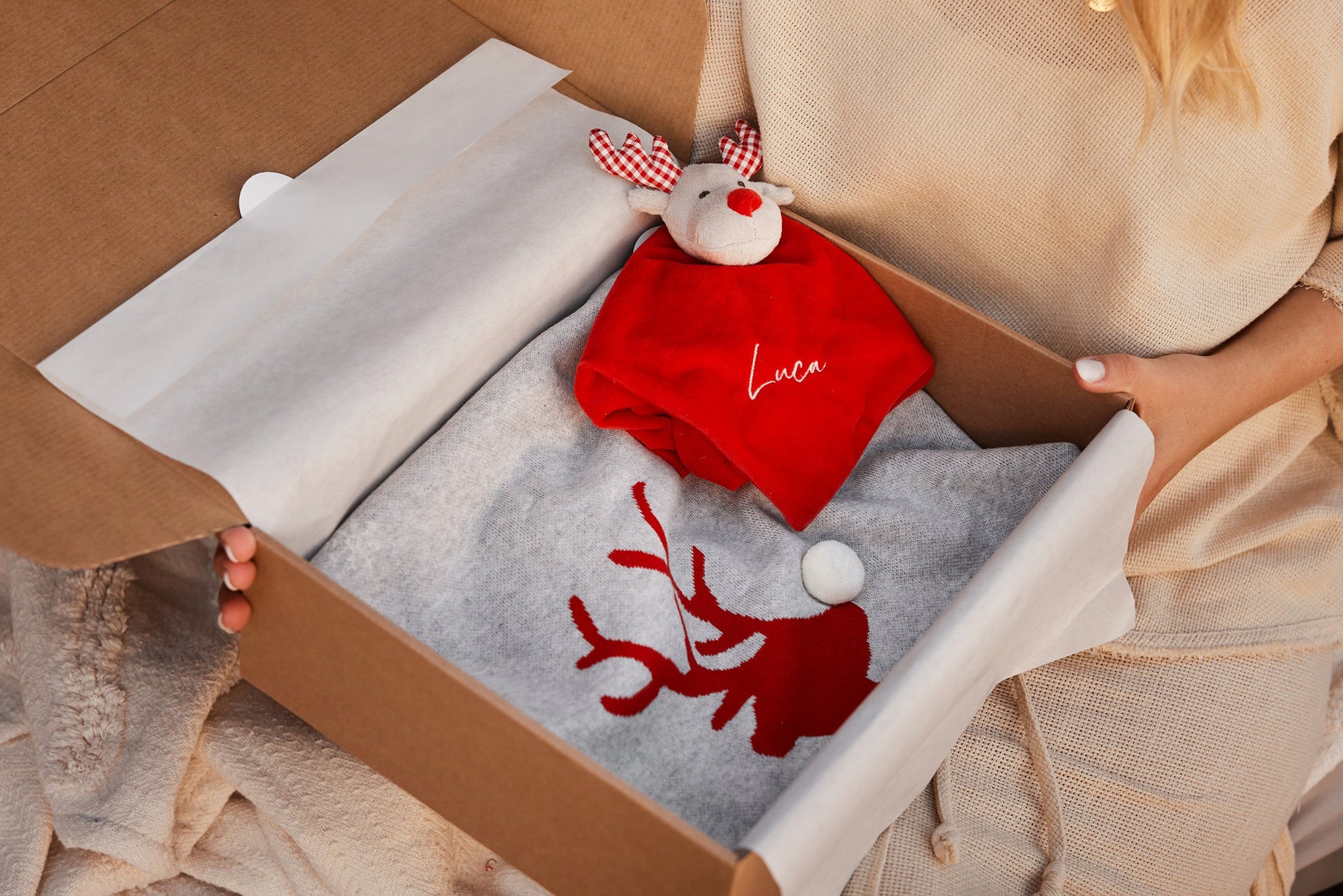 Predstavljajte si iskrive oči, ki na praznično jutro ugledajo praznično odejico z jelenčkom z malčkovim imenom, poleg nje pa še prikupno ninico severni jelenček.