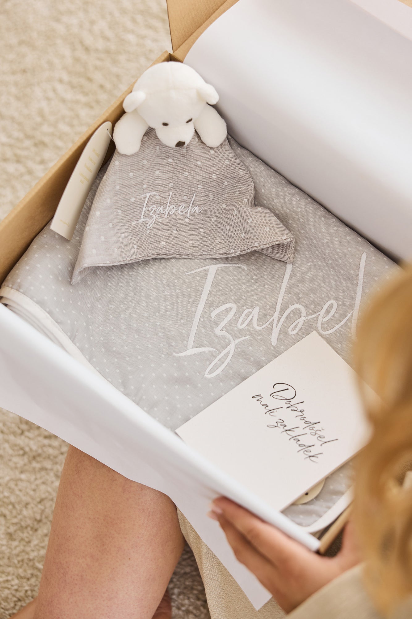 Predstavljamo vam set s sivo tetra odejico s pikicami in ninico polarni medvedek, ki bo očaral vsako novopečeno mamico in razveselil njen zakladek.