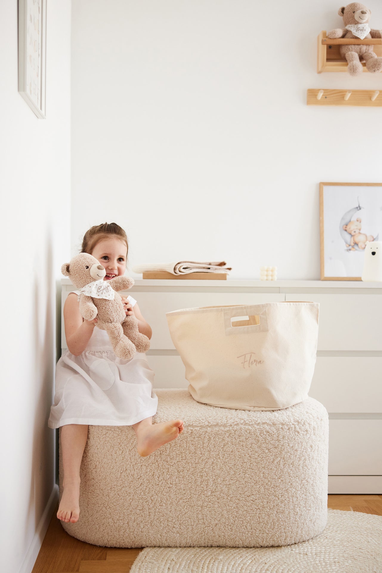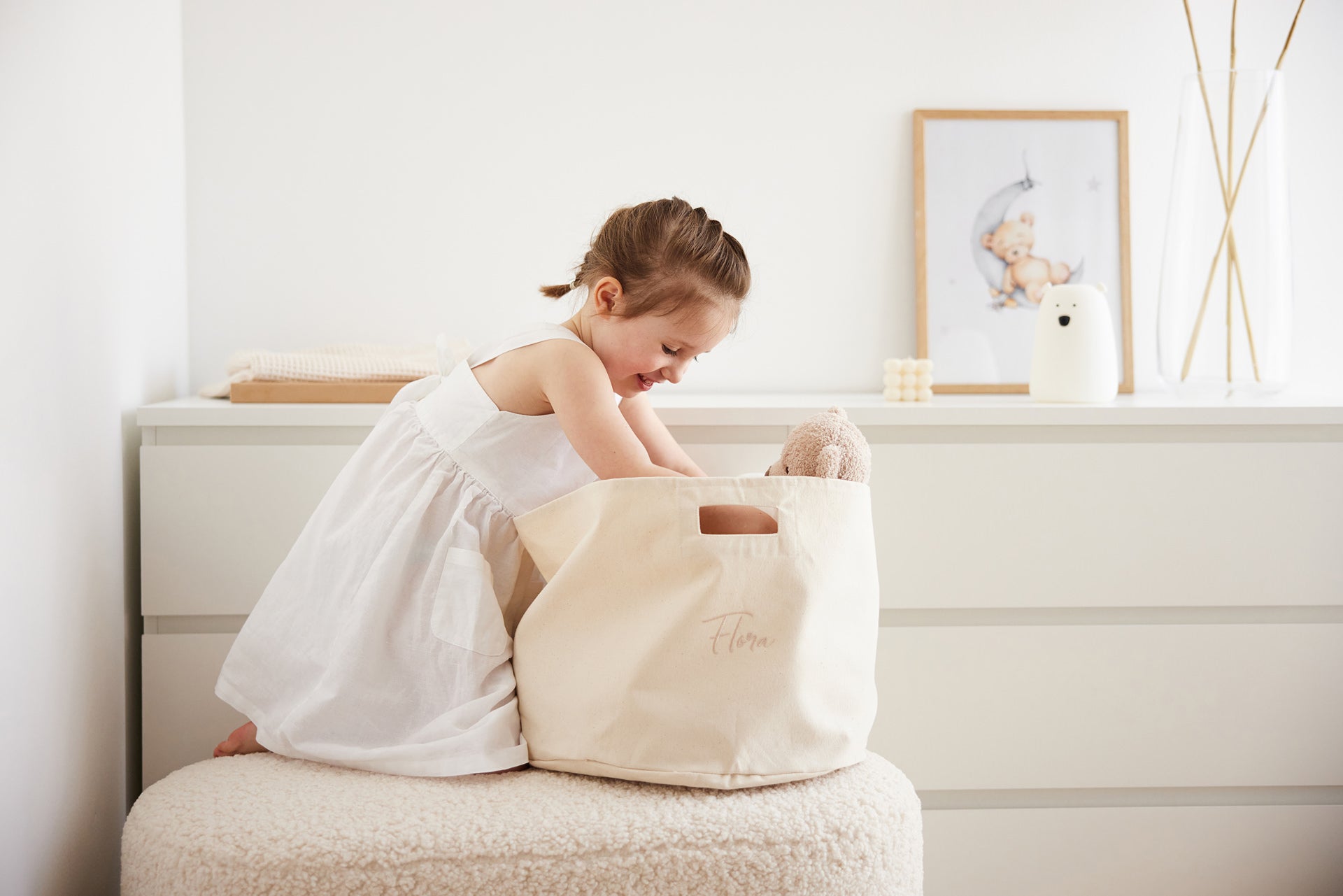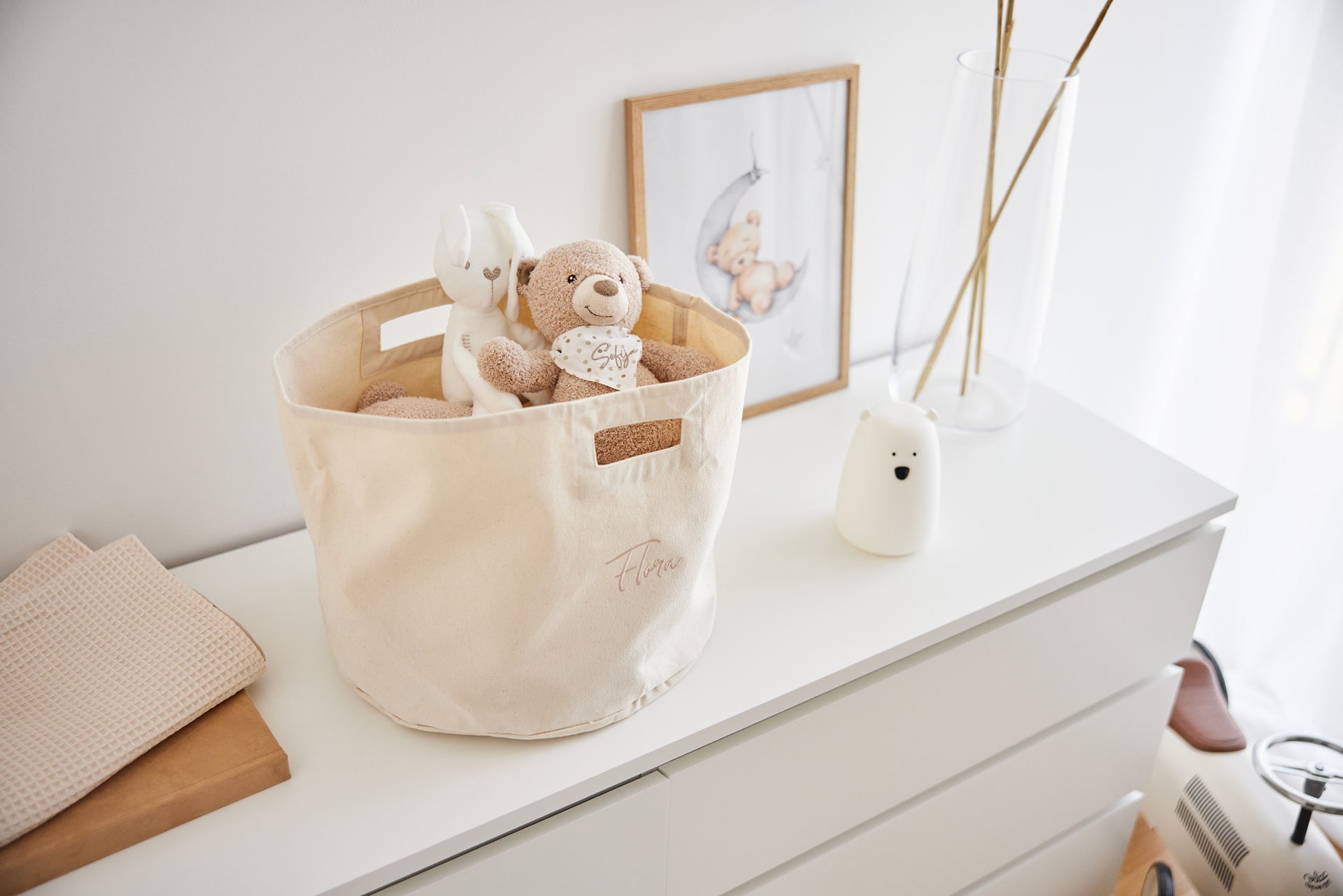 Prikupen in mehak manjši bombažni koš za igrače bo polepšal vsako otroško sobico, malčka pa spodbudil, da bodo igračke vedno na svojem mestu.