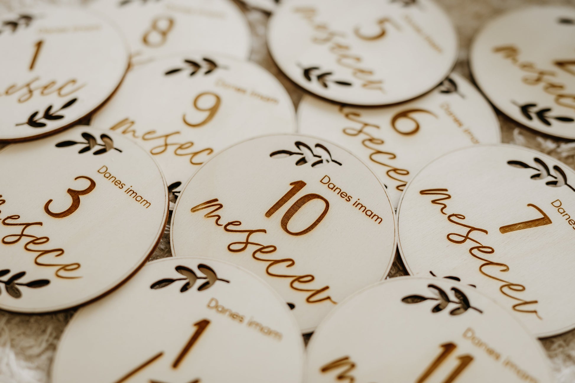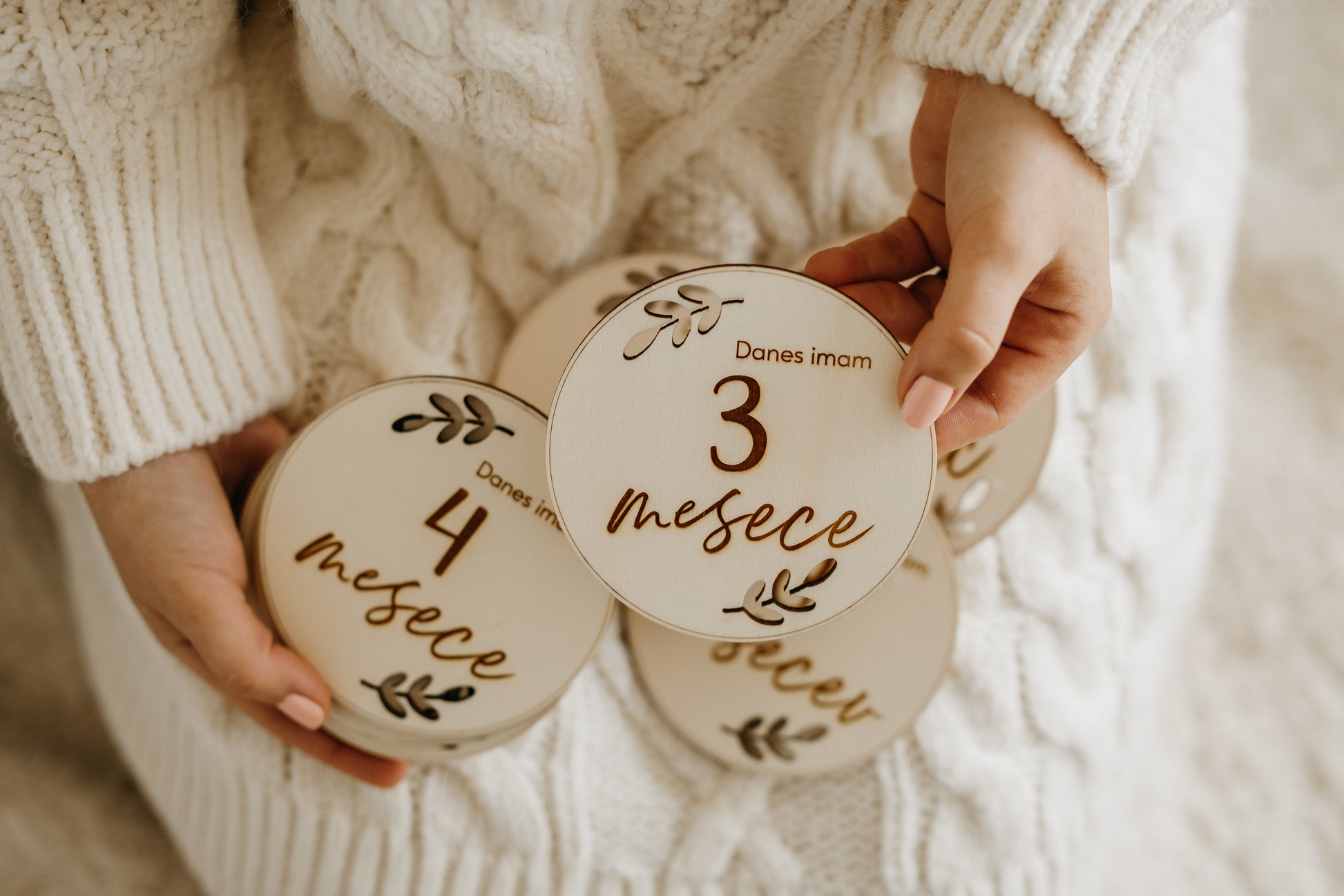 Set okroglih lesenih kartic vsebuje mejnike za praznovanje prvih enajstih mesecev in 1. leta.
