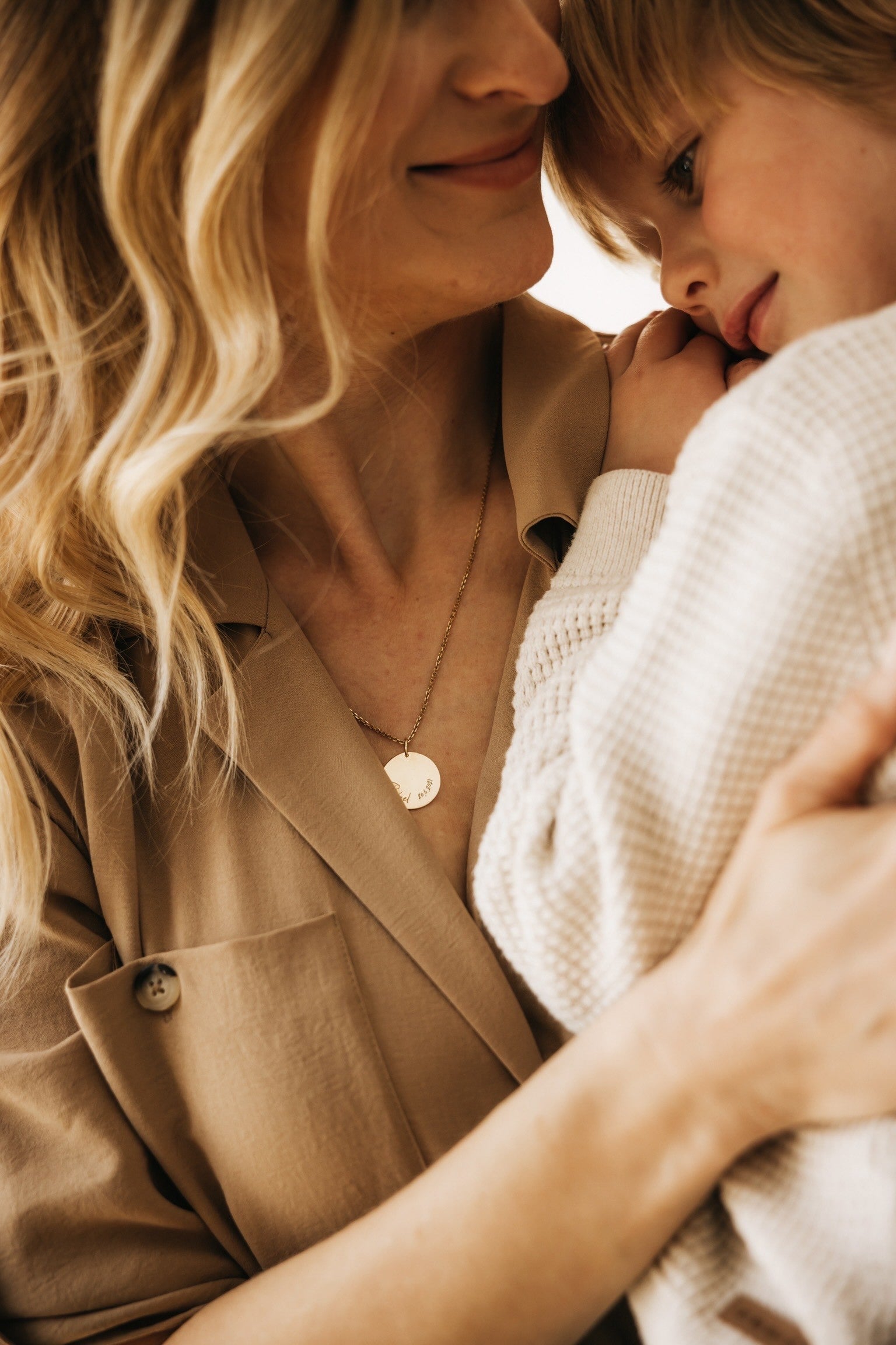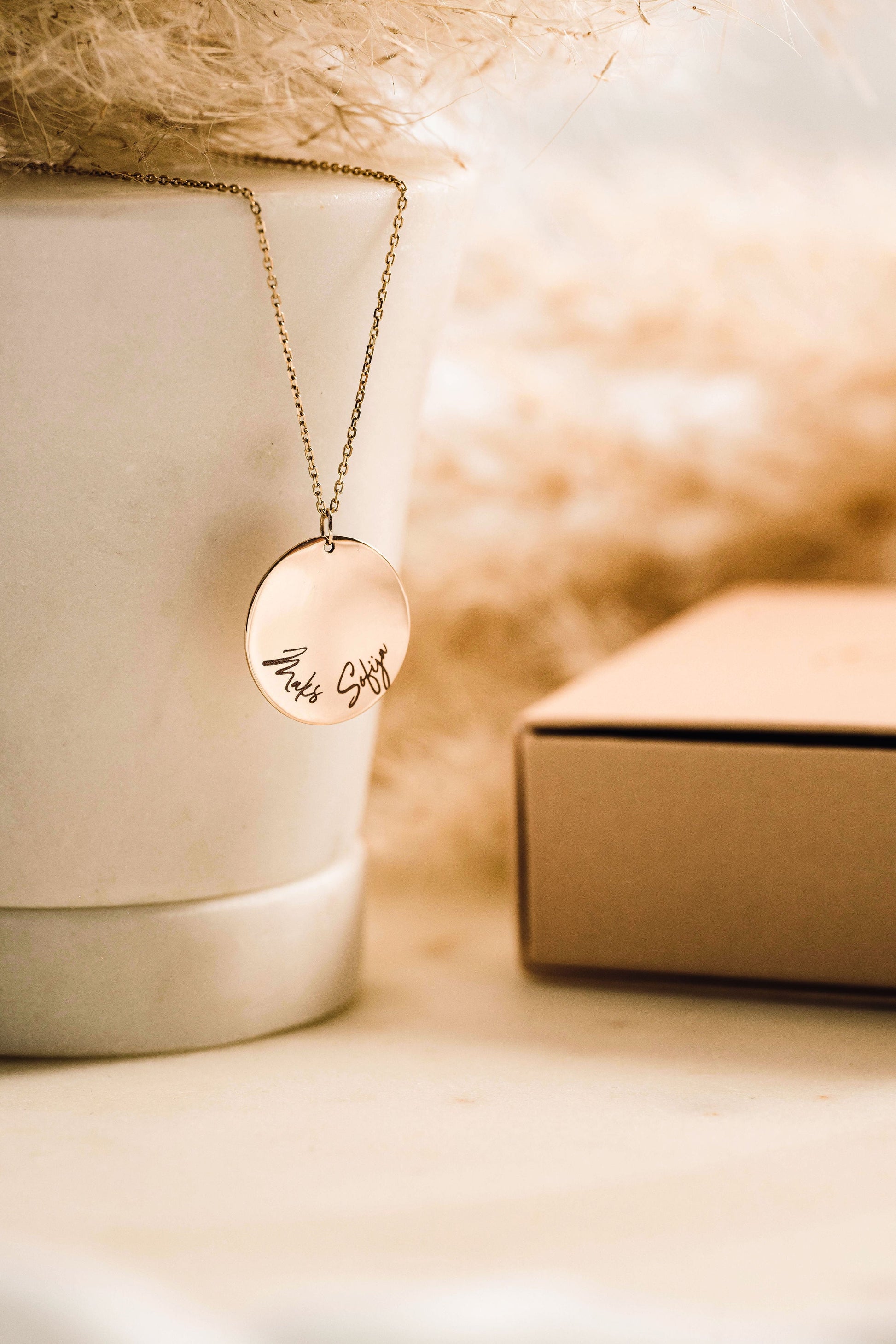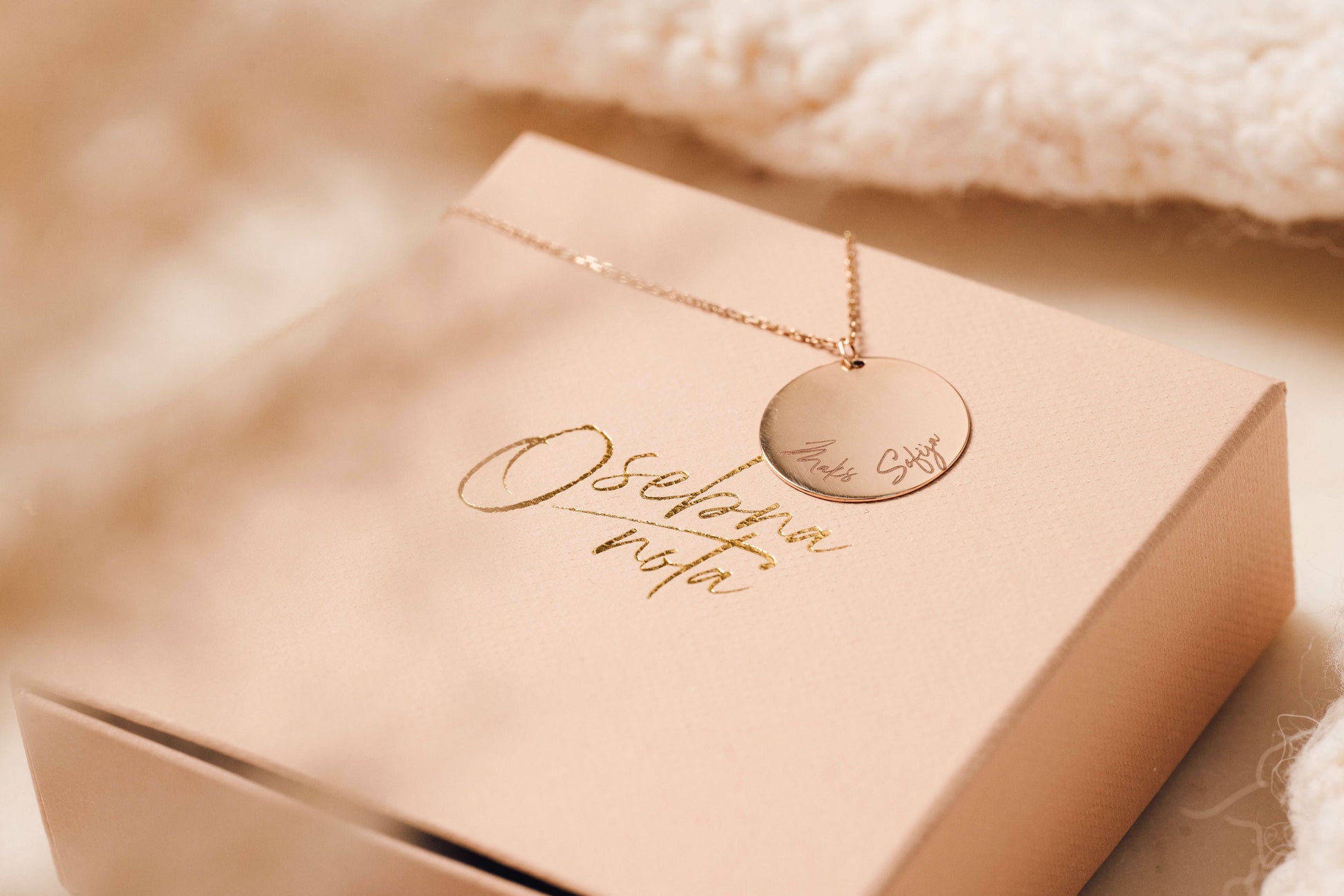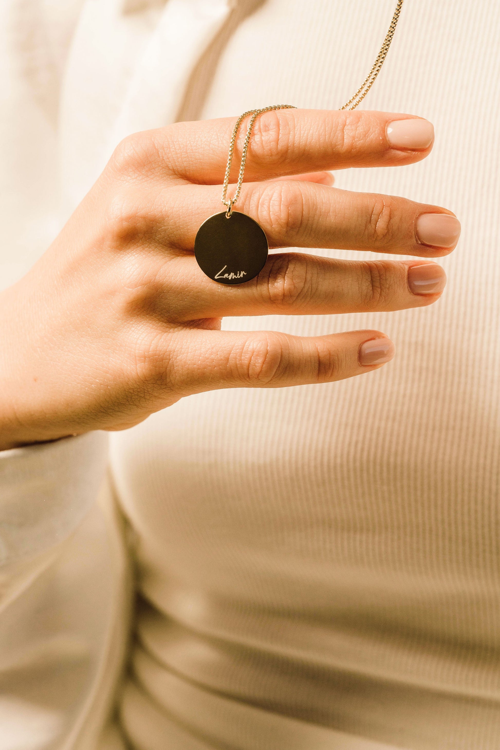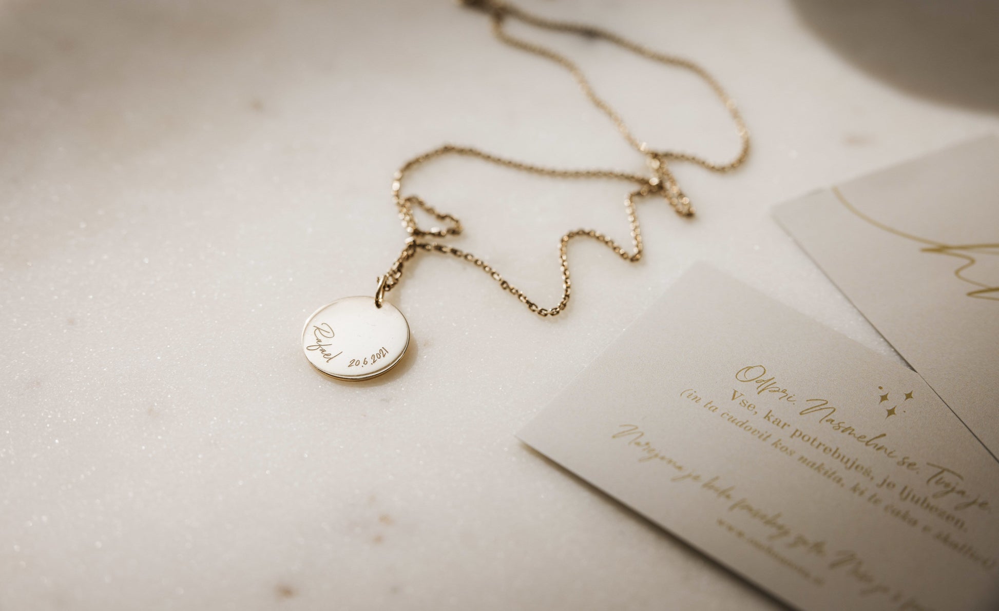 Personalizirana minimalistična verižica z medaljonom, na katerega vgraviramo ime obdarovanca ali malčka (po želji tudi rojstni datum ali imena večih otrok).