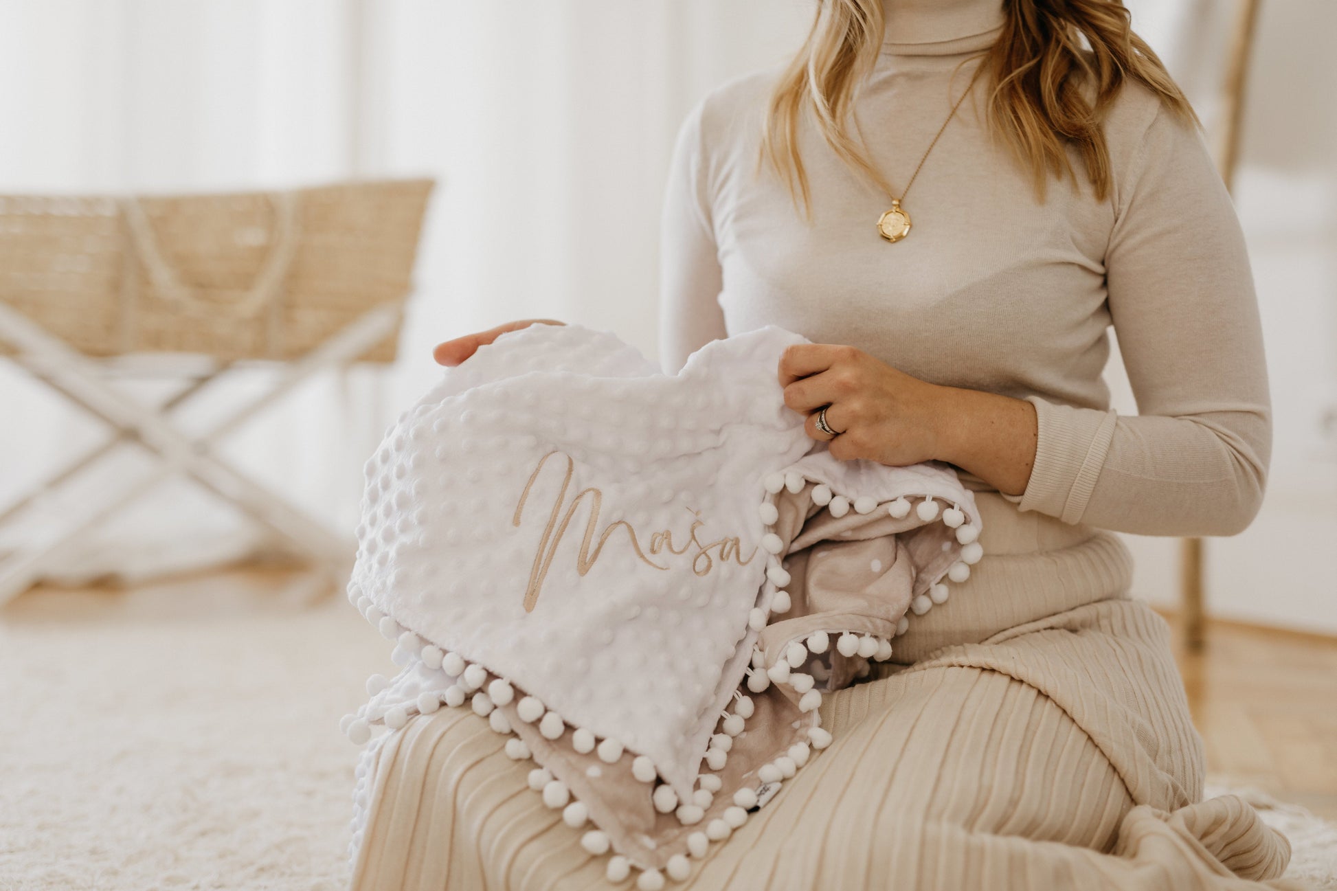 MInky bež odeja s pom pomi + zajček dolgouhec