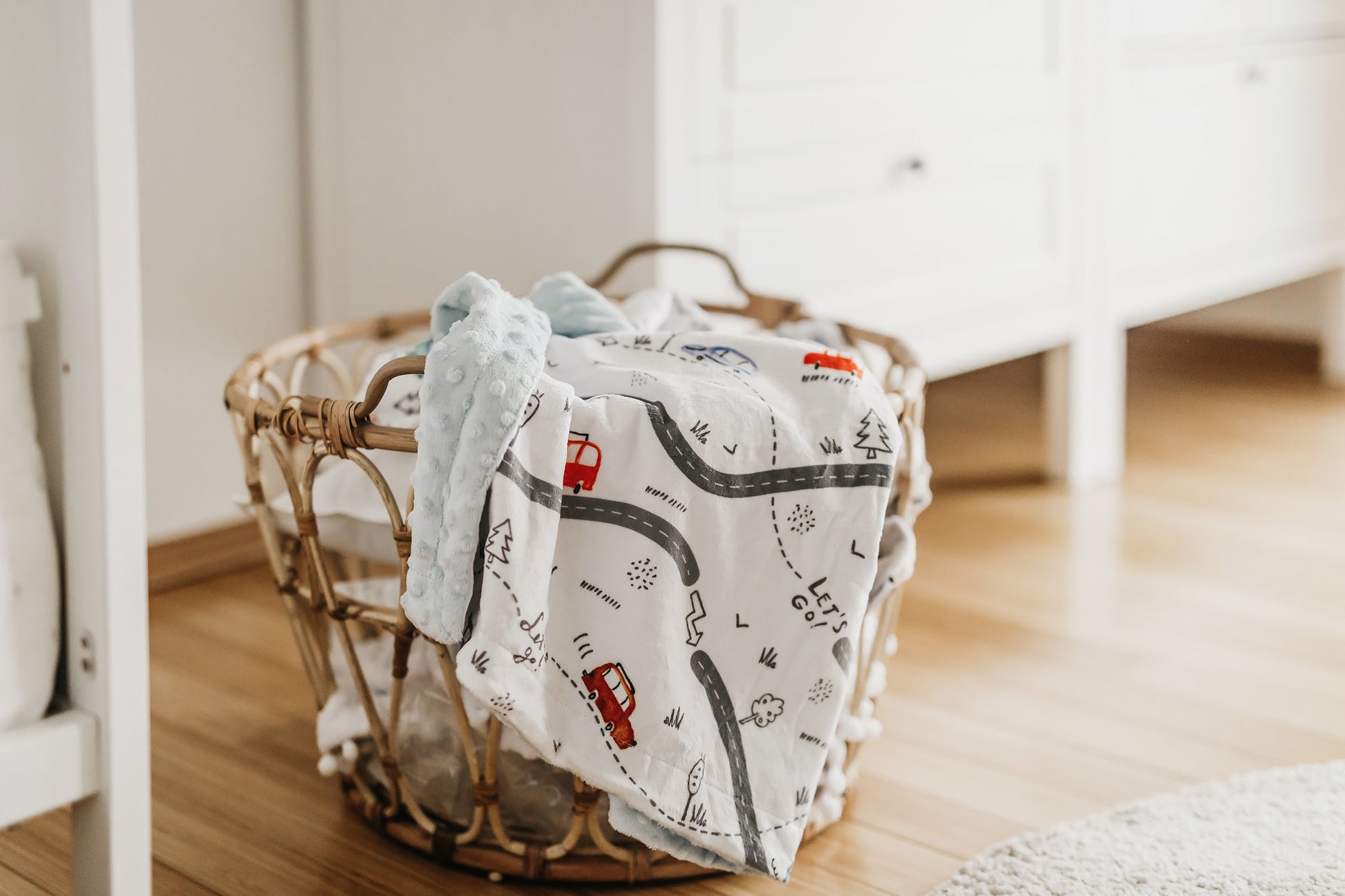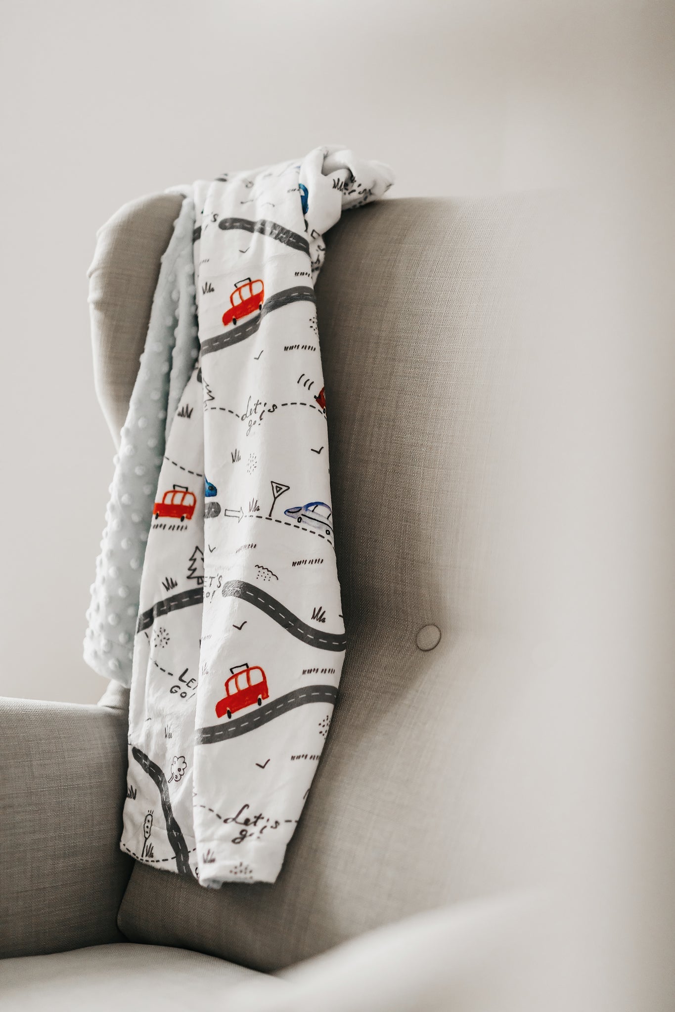 Na eni strani moder minky, na drugi pa termoflis s potiskom avtomobilčkov. Napis imena je izvezen v modri barvi.