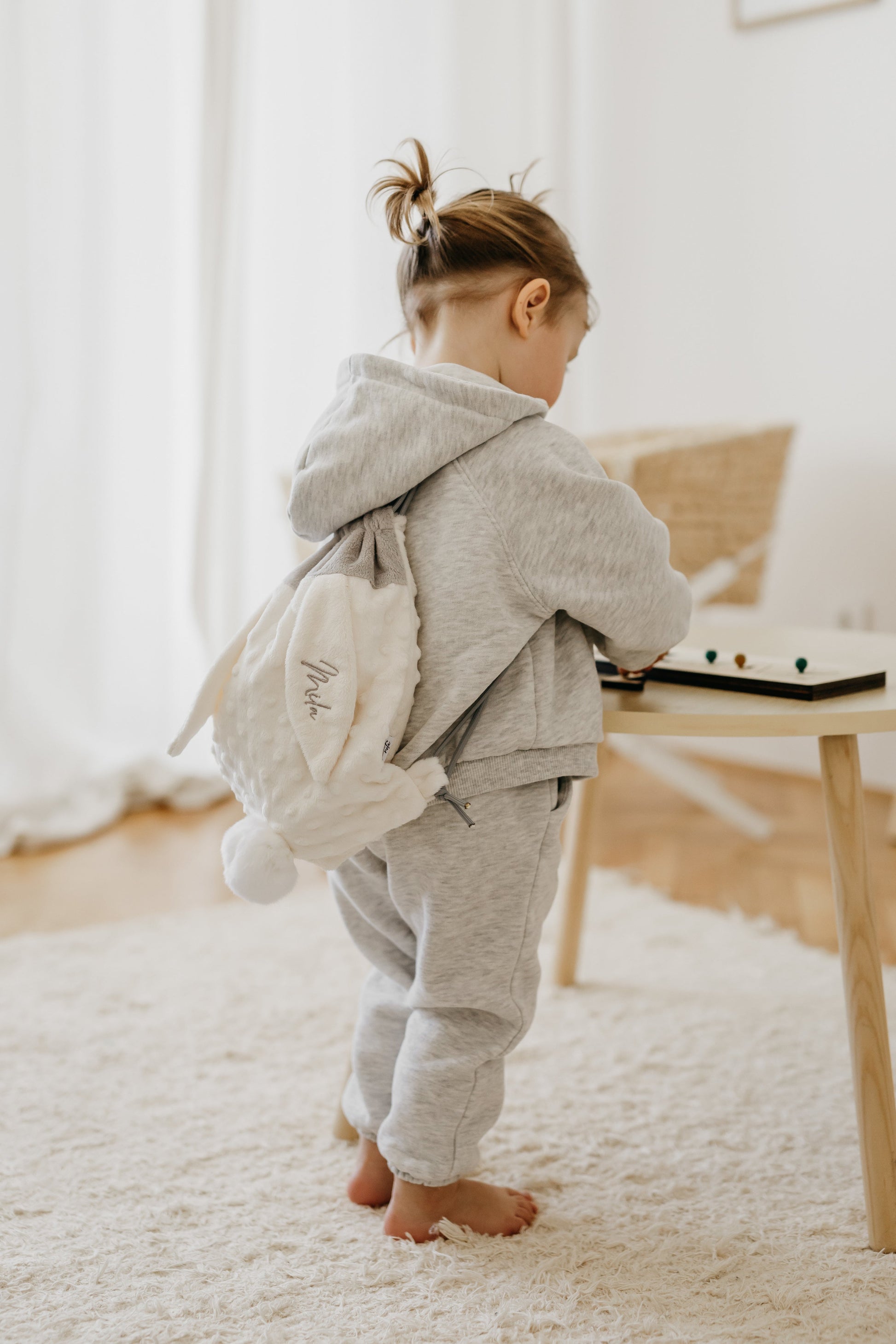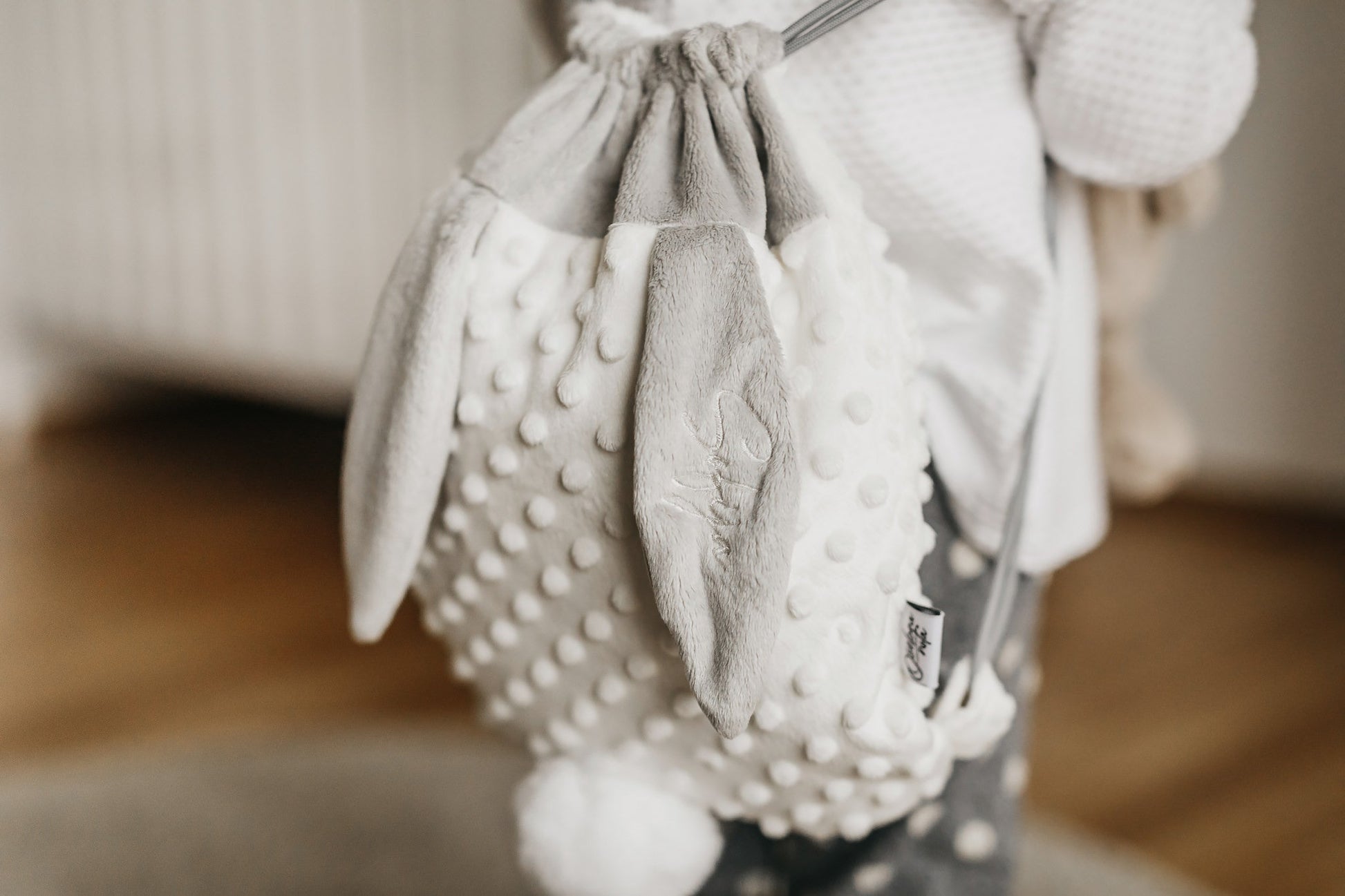 Nahrbtniček krasijo mehka ušeska, na katera izvezemo ime vašega malčka. Otrok bo tako imel najbolj prepoznaven nahrbtnik v skupini, ki ga ne bo moč zamenjati. Zagotvo pa ga želel z njim crkljati še kdo. :)