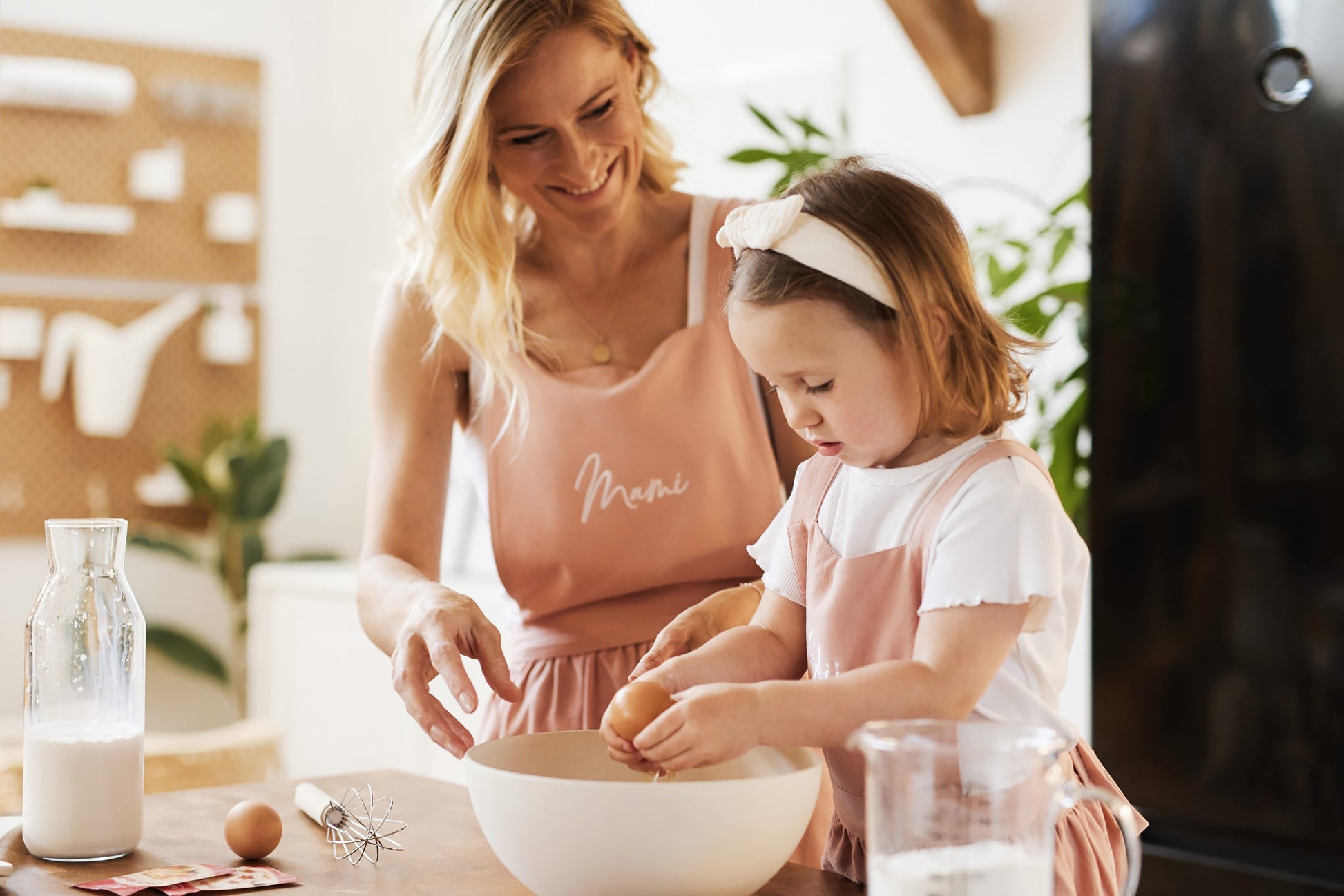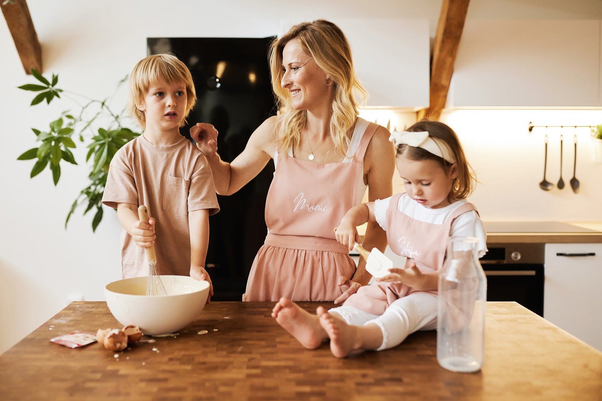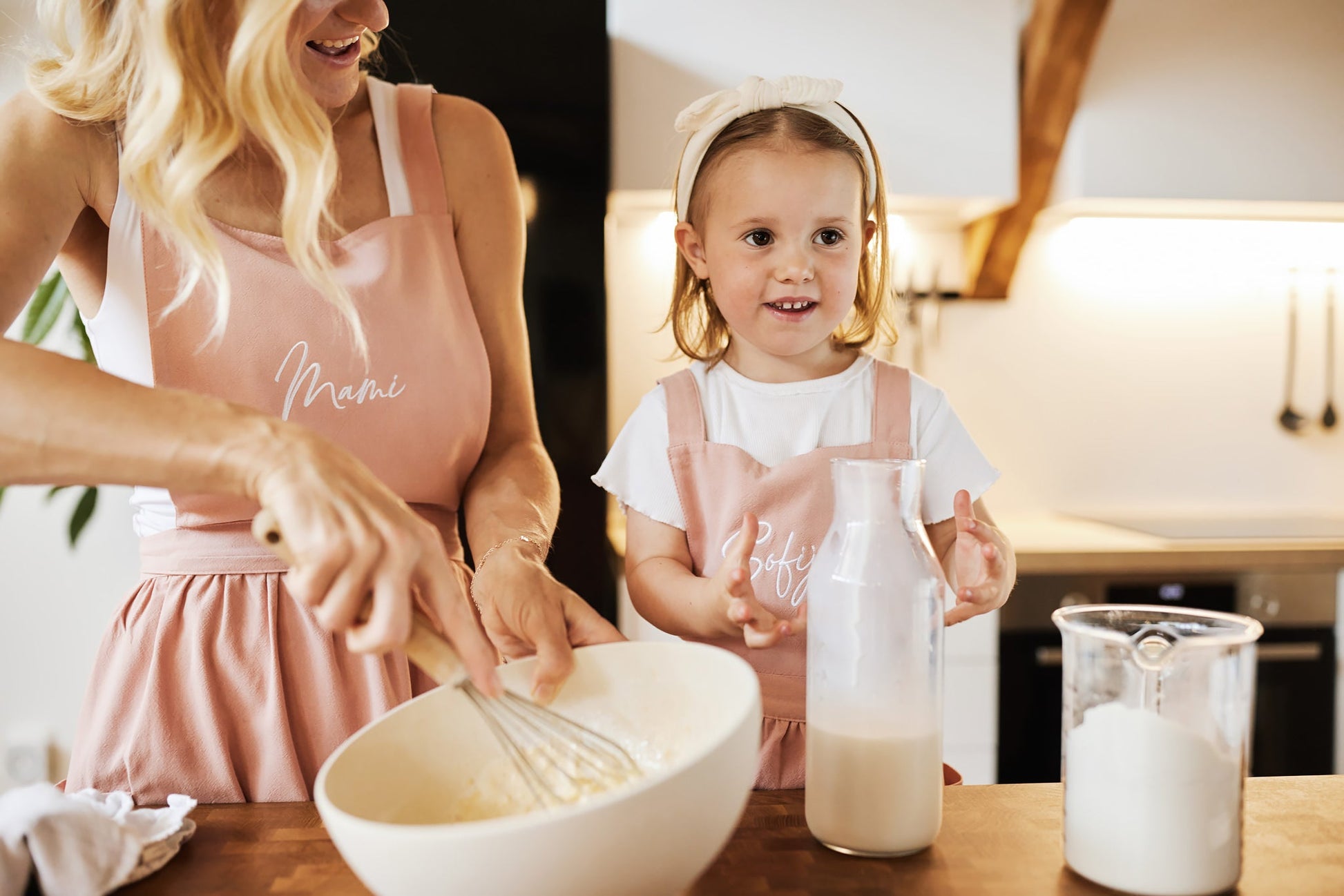 Za matchy look imamo na voljo tudi otroške predpasnike v roza in bež barvi. Tako boste z vašim malčkom pravi kuharski tandem.