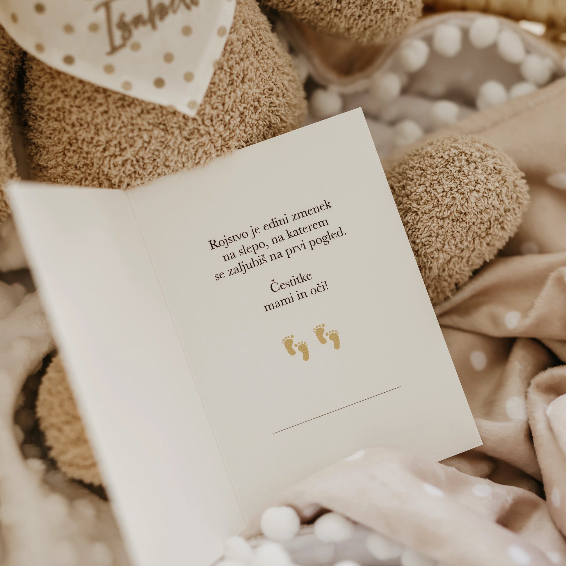 Naš telegram s plišastim medvedkom in voščilnico ob rojstvu Dobrodošel mali zakladek je popoln način, da pokažete svojo srečo ob rojstvu in ustvarite dragocen spomin za družinico.