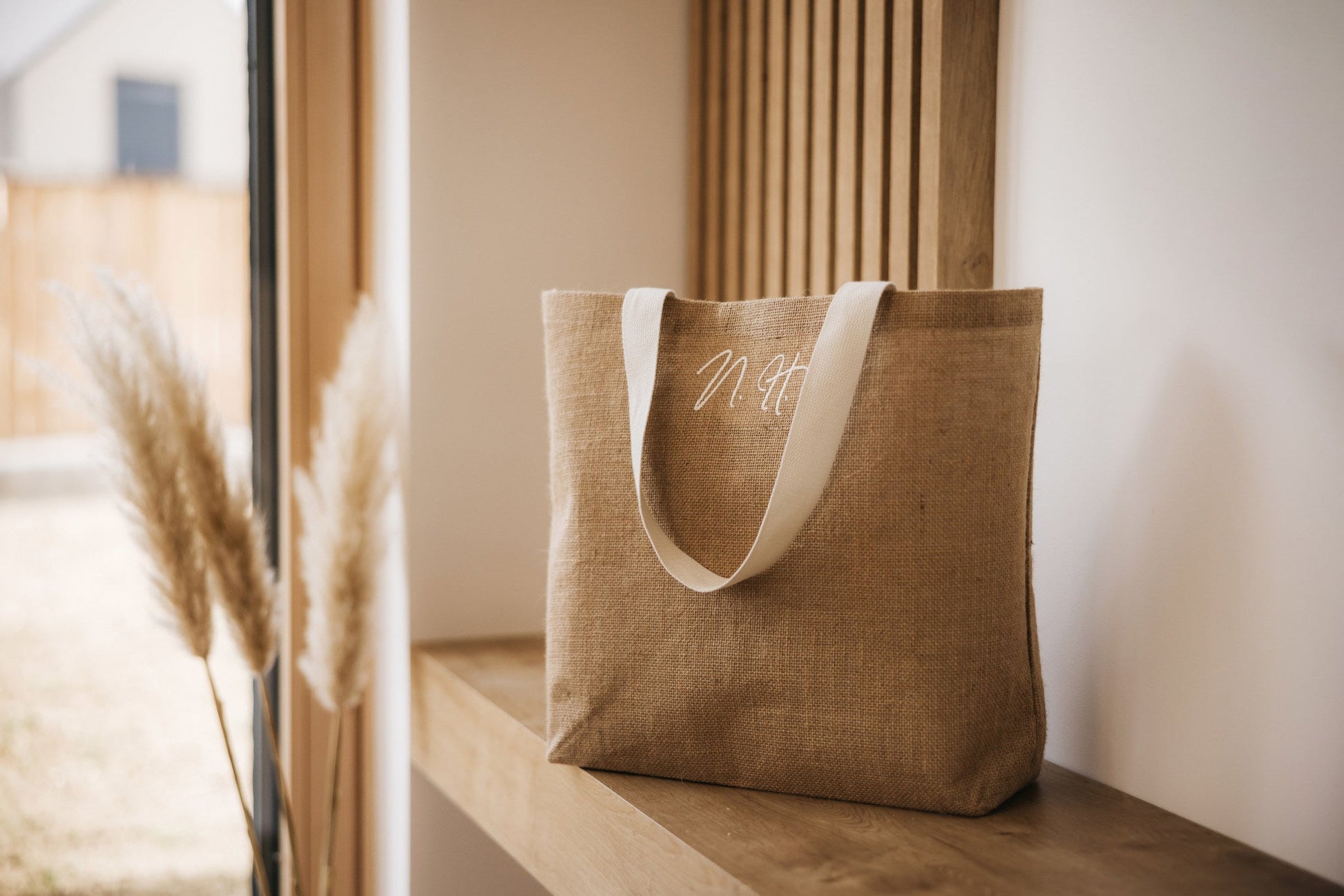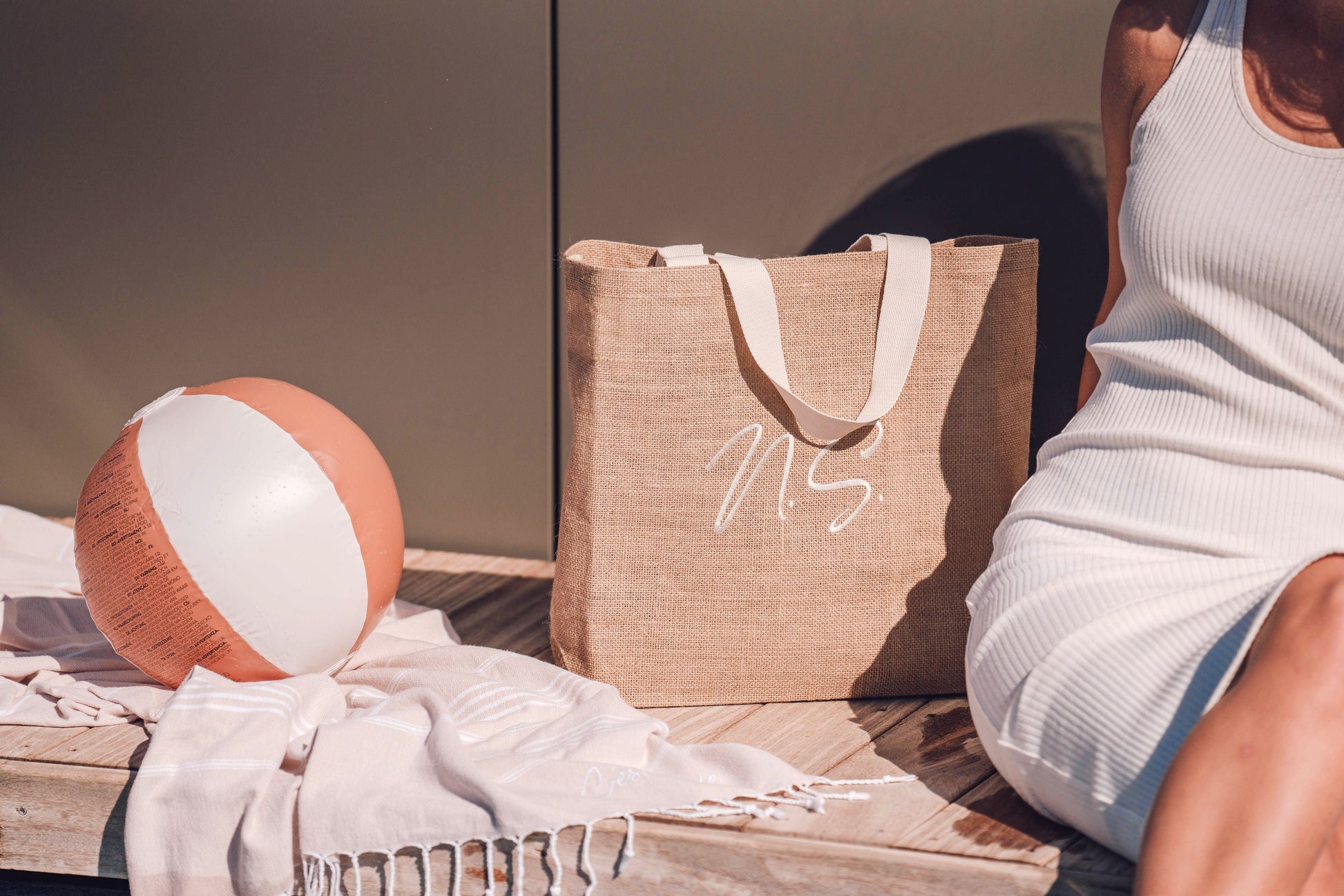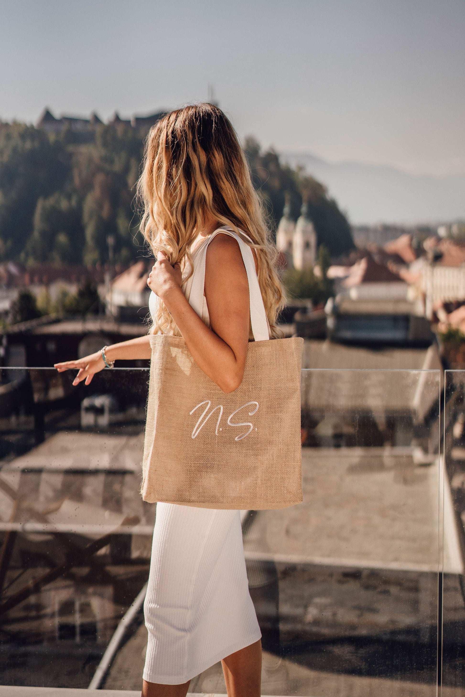 Dopolnite vaše poletne outfite s trendovsko torbo iz jute z belimi ročaji, na katero izvzemo vaše ime ali inicialke.