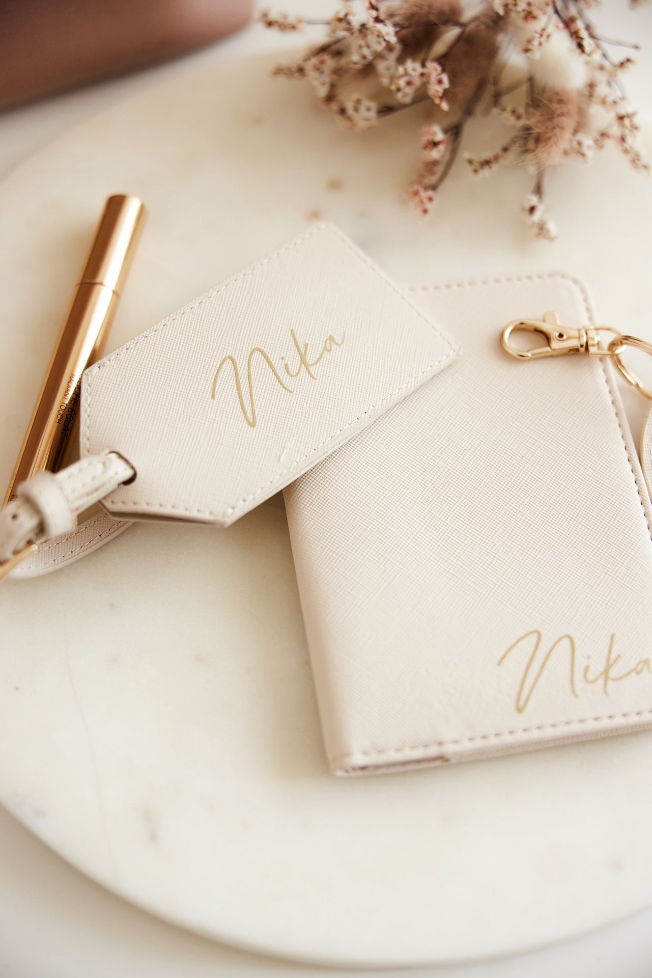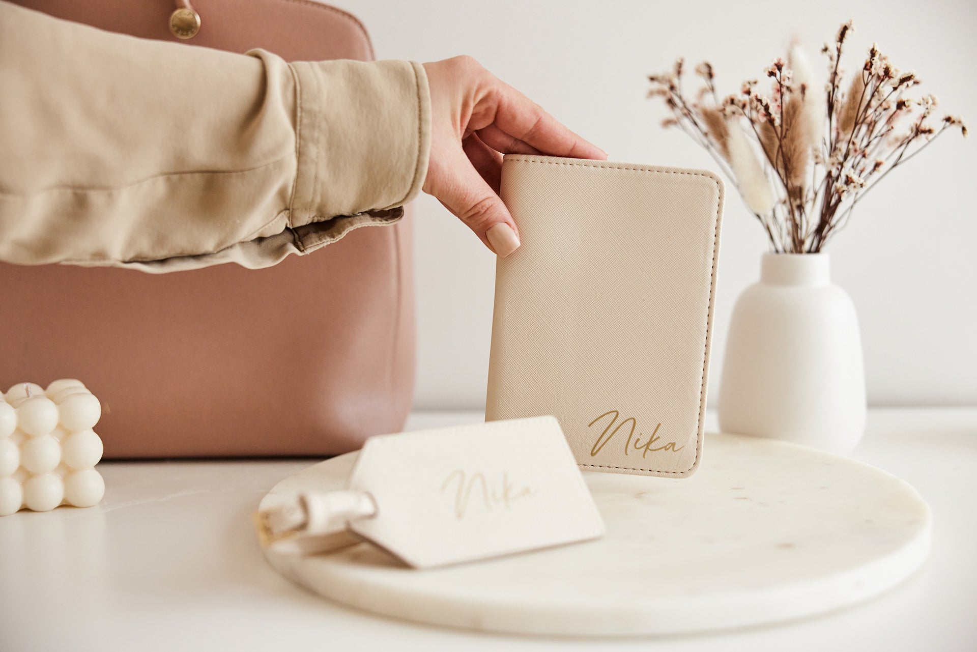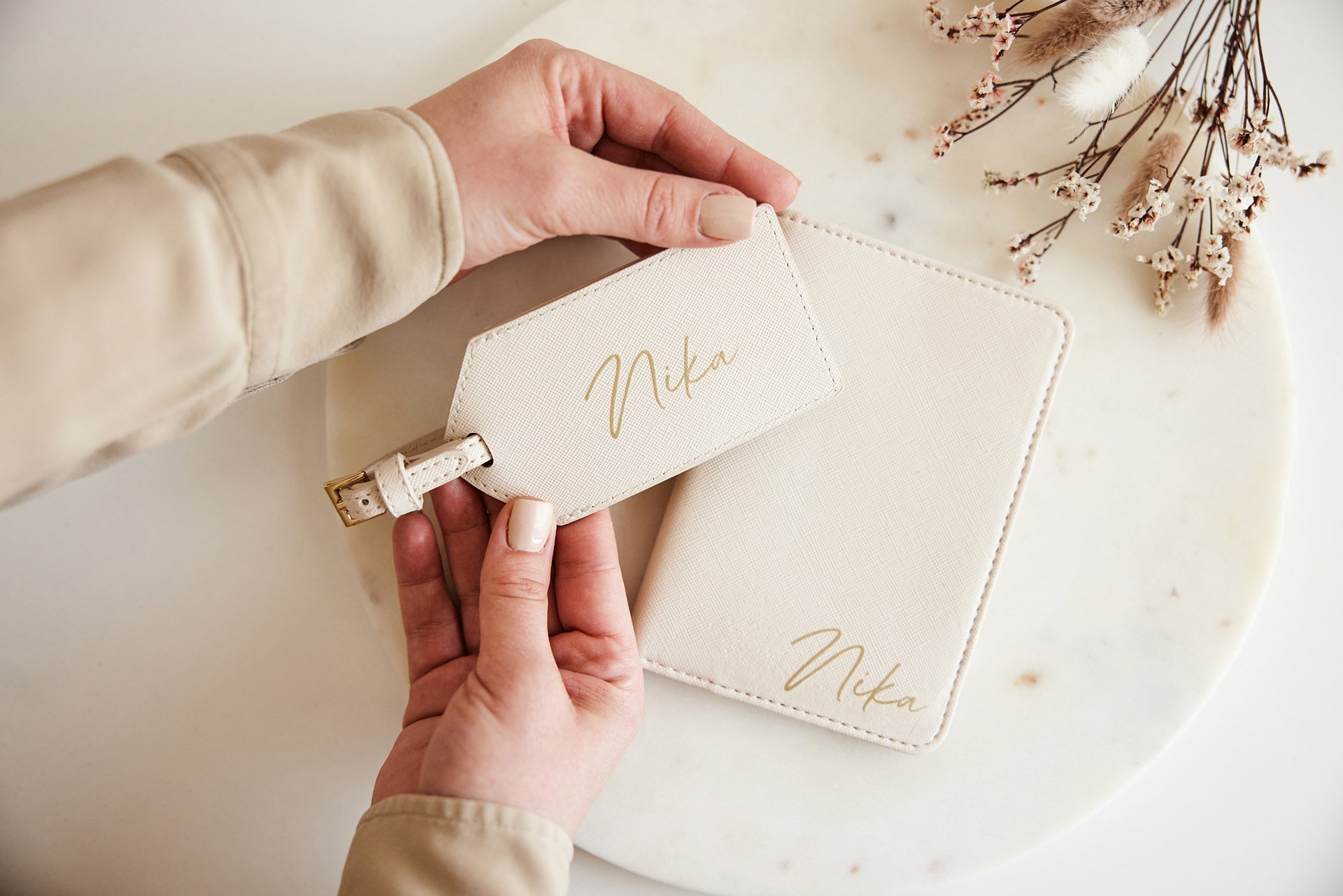 Izrazite svoj osebni stil s personaliziranim potovalnim setom. Set vsebuje obešanko za potovalko in ovitek za potni list.