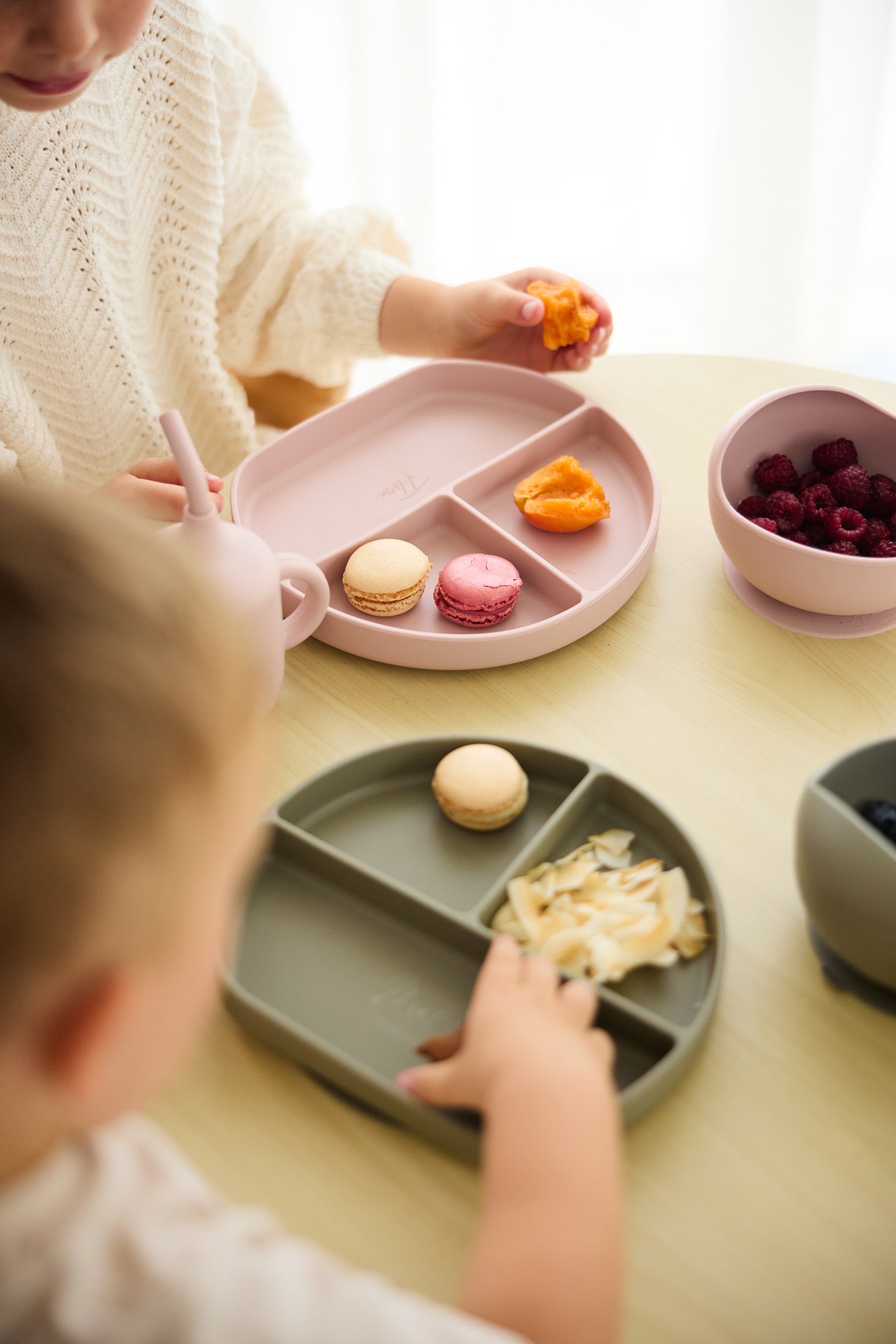 Krožnik je razdeljen na tri ločene predele, da lahko enostavno ločite hrano. Drsenje smo preprečili tako, da se krožnik enostavno prisesa na mizo. Praktično, kajne?