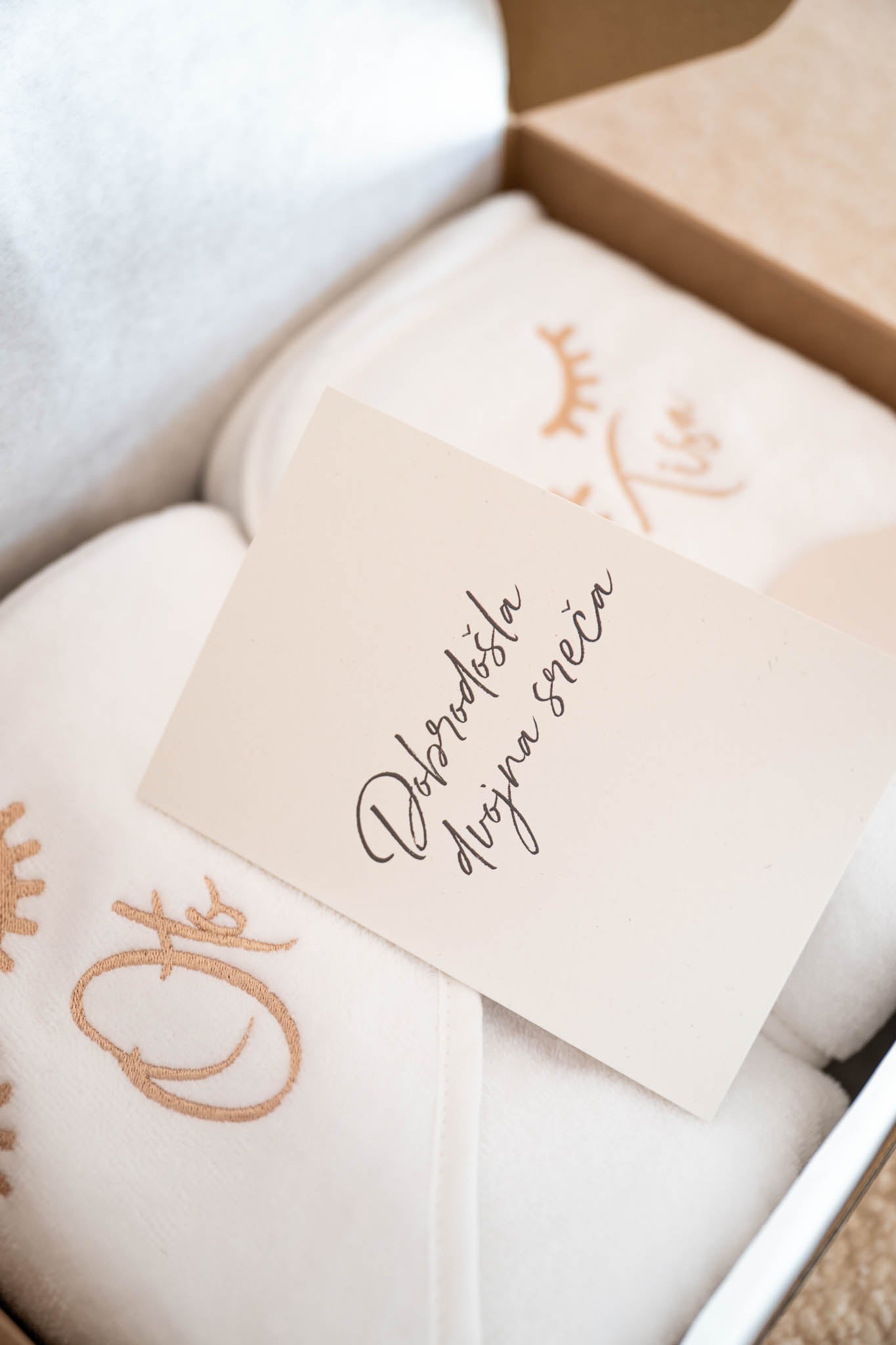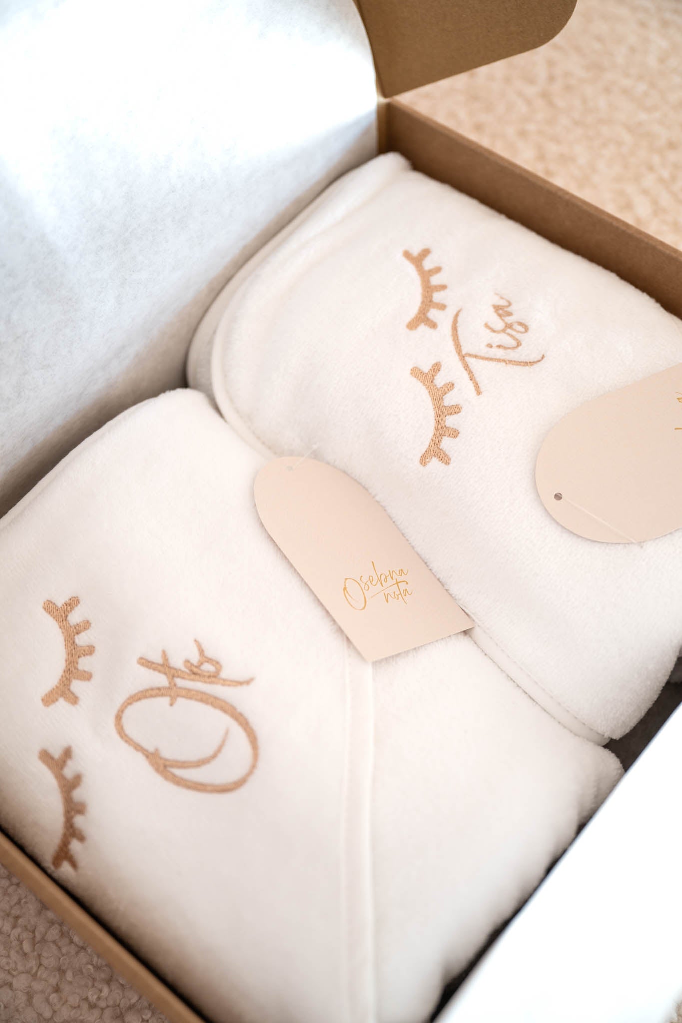 • Dve brisački z vezenino imen otrok dimenzije 75 x 75 cm, 100 % bombaž