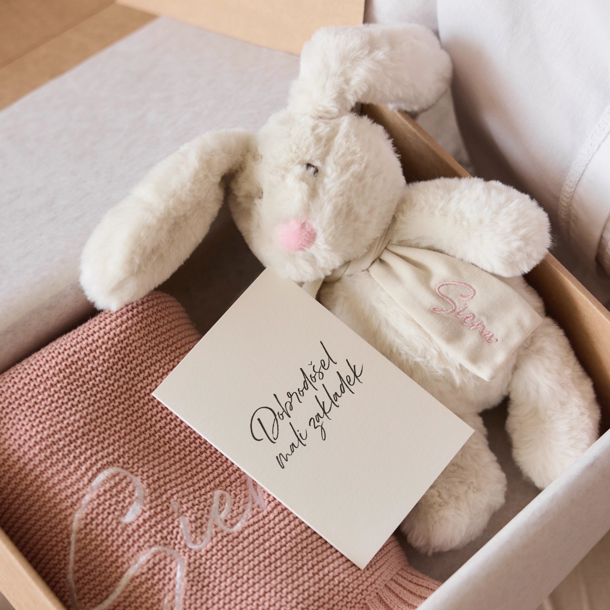 Naš telegram s pleteno roza bombažno odejico, zajčkom iz recikliranega materiala in voščilnico ob rojstvu bo očaral vsako novopečeno mamico.