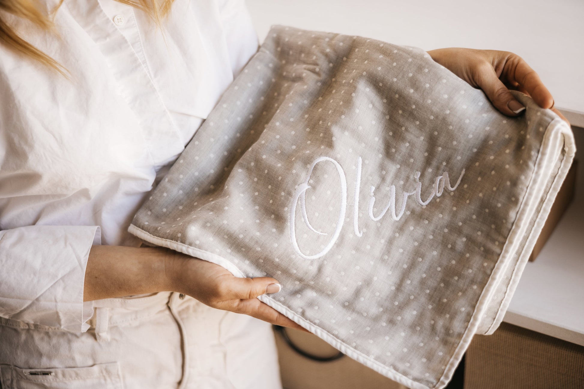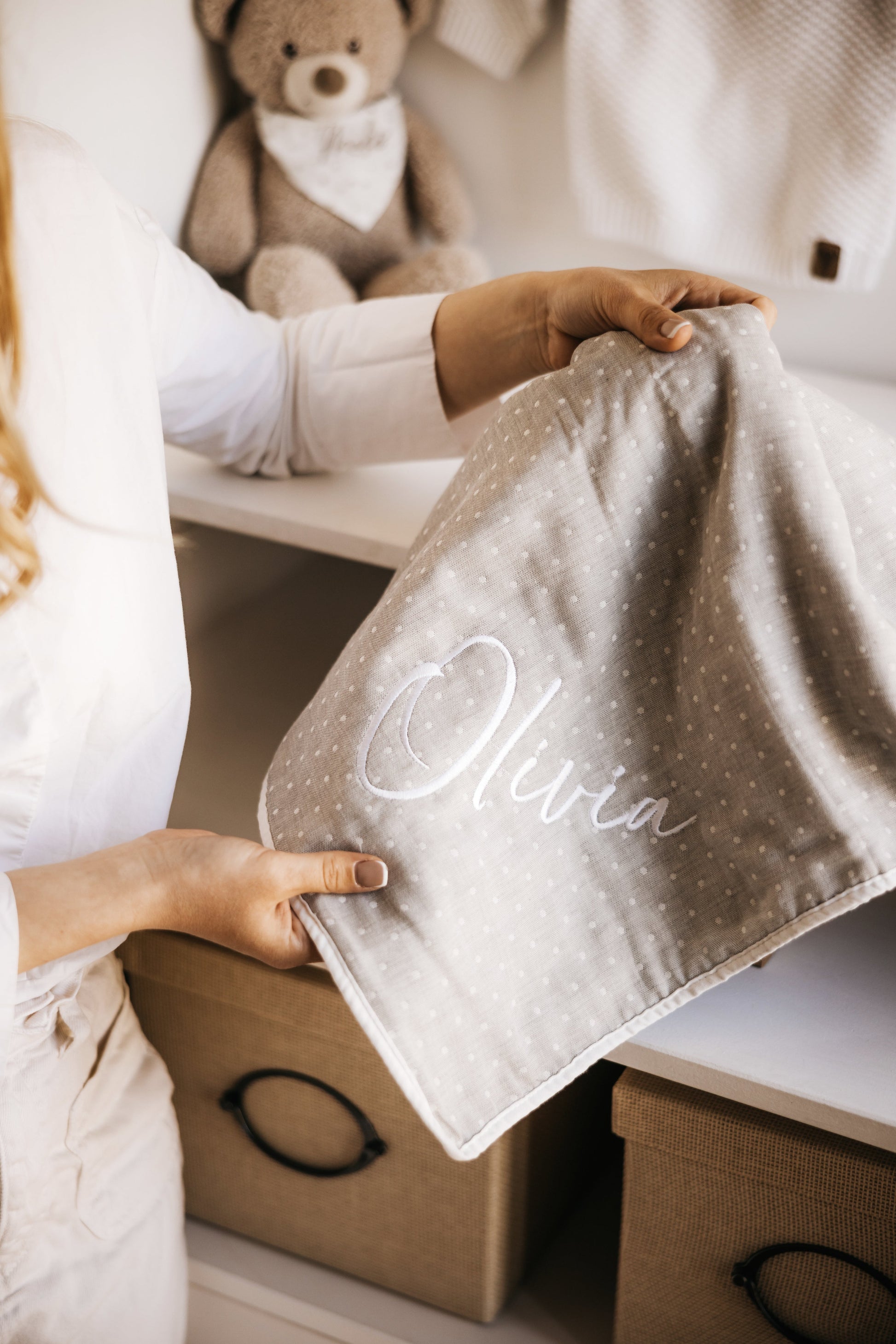 Našli ste ga. Tukaj je naša prikupna siva tetra odejica z belimi pikicami, primerna tako za dečke in deklice. Ime otroka izvezemo v beli barvi.