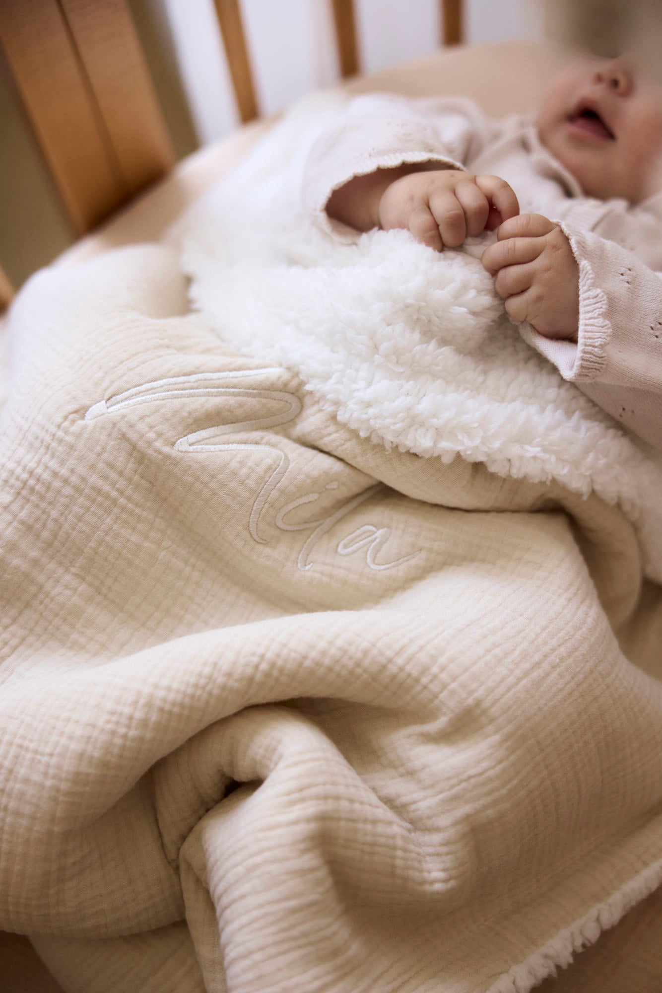Neverjetno mehka in topla odejica, narejena iz sherpa (mehke kosmatene) tkanine na eni strani in muslin tkanine na drugi strani. Idealna za sprehode v vozičku v prehodnih letnih časih, da bo dojenčku prijetno in toplo.