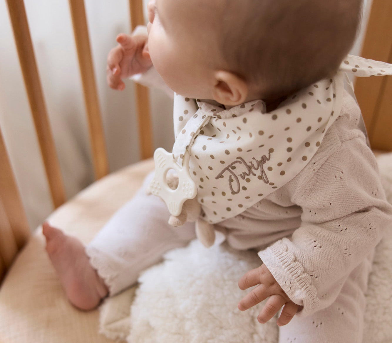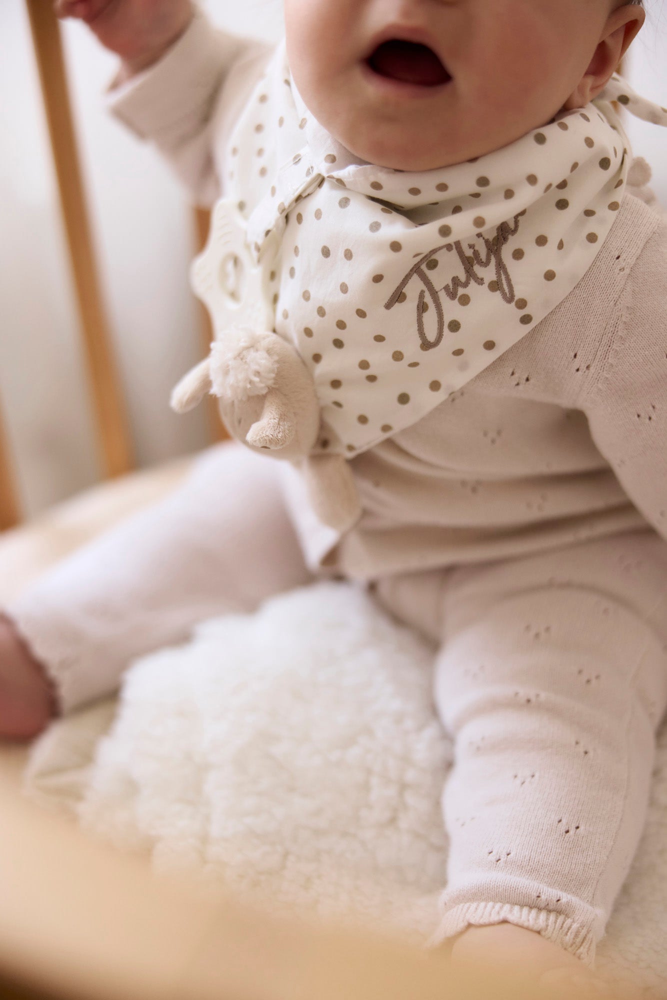 Zdaj bomo poskrbeli še, da bodo obleke vašega malčka ostale čiste in suhe. Trikotna rutka oziroma slinček s prikupno ovčko je primeren za dojenčke in otroke v starosti do 2. leta. Zapenja se z ježkom in tako raste z malčkom. Na rutko izvezemo ime malčka.