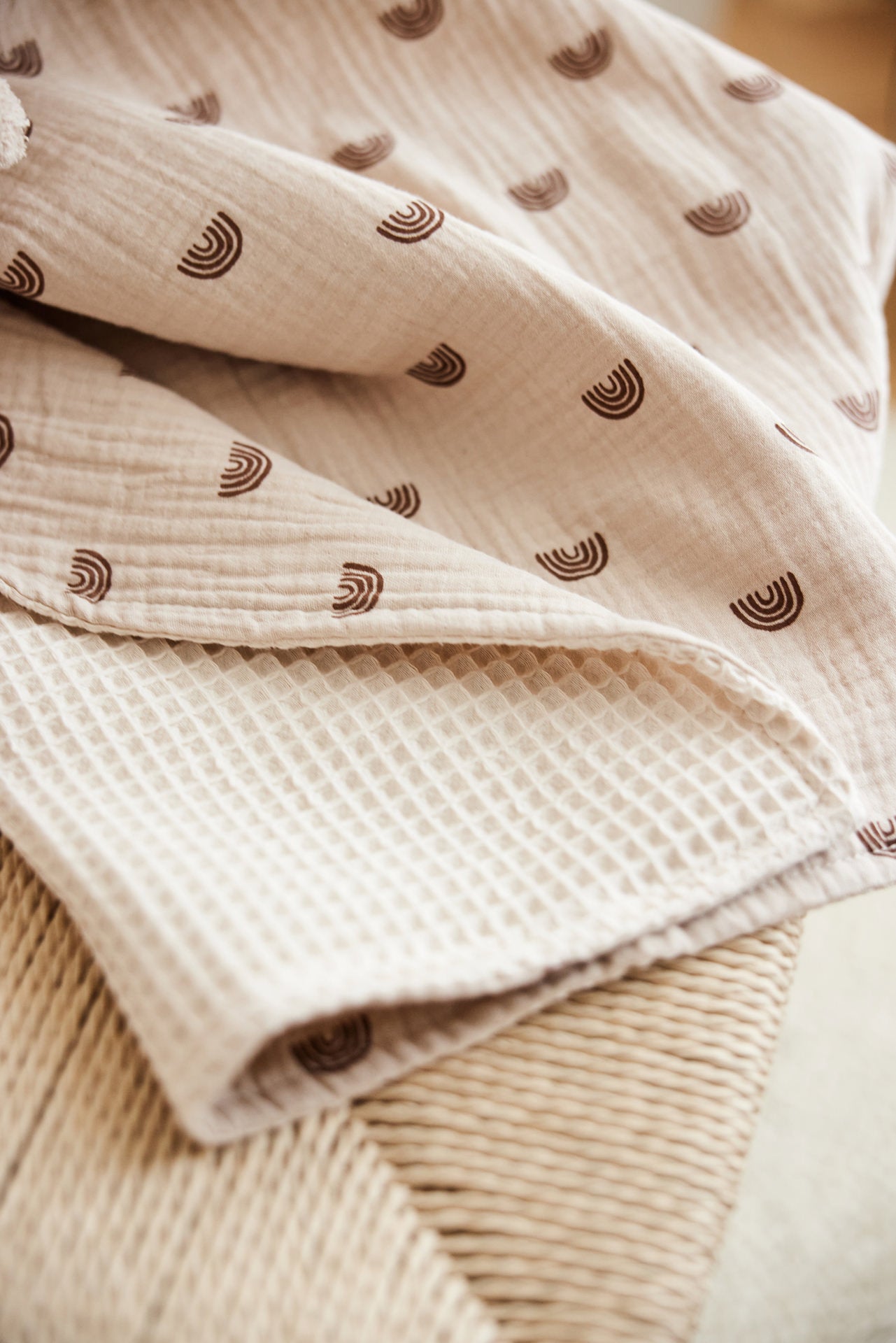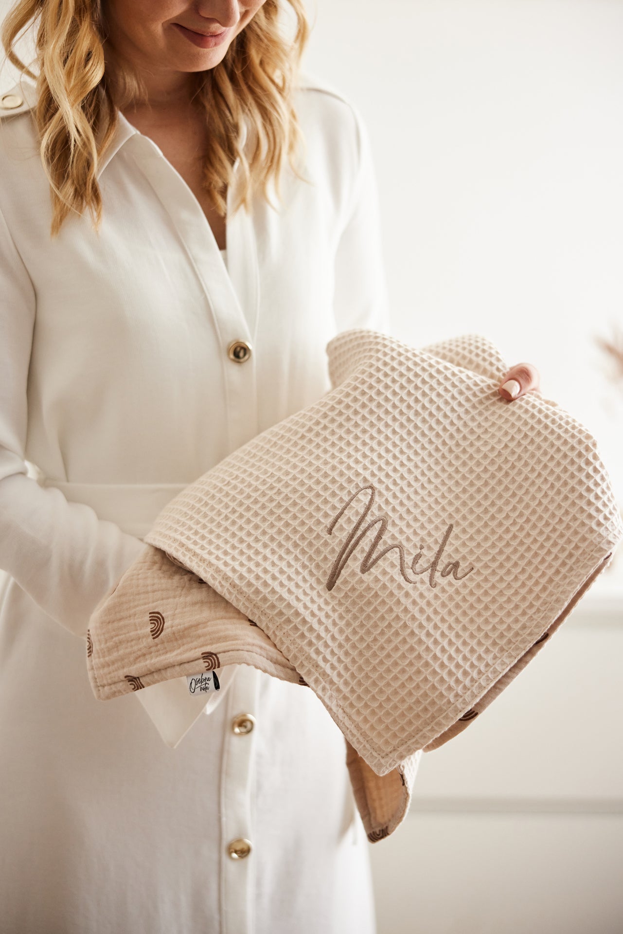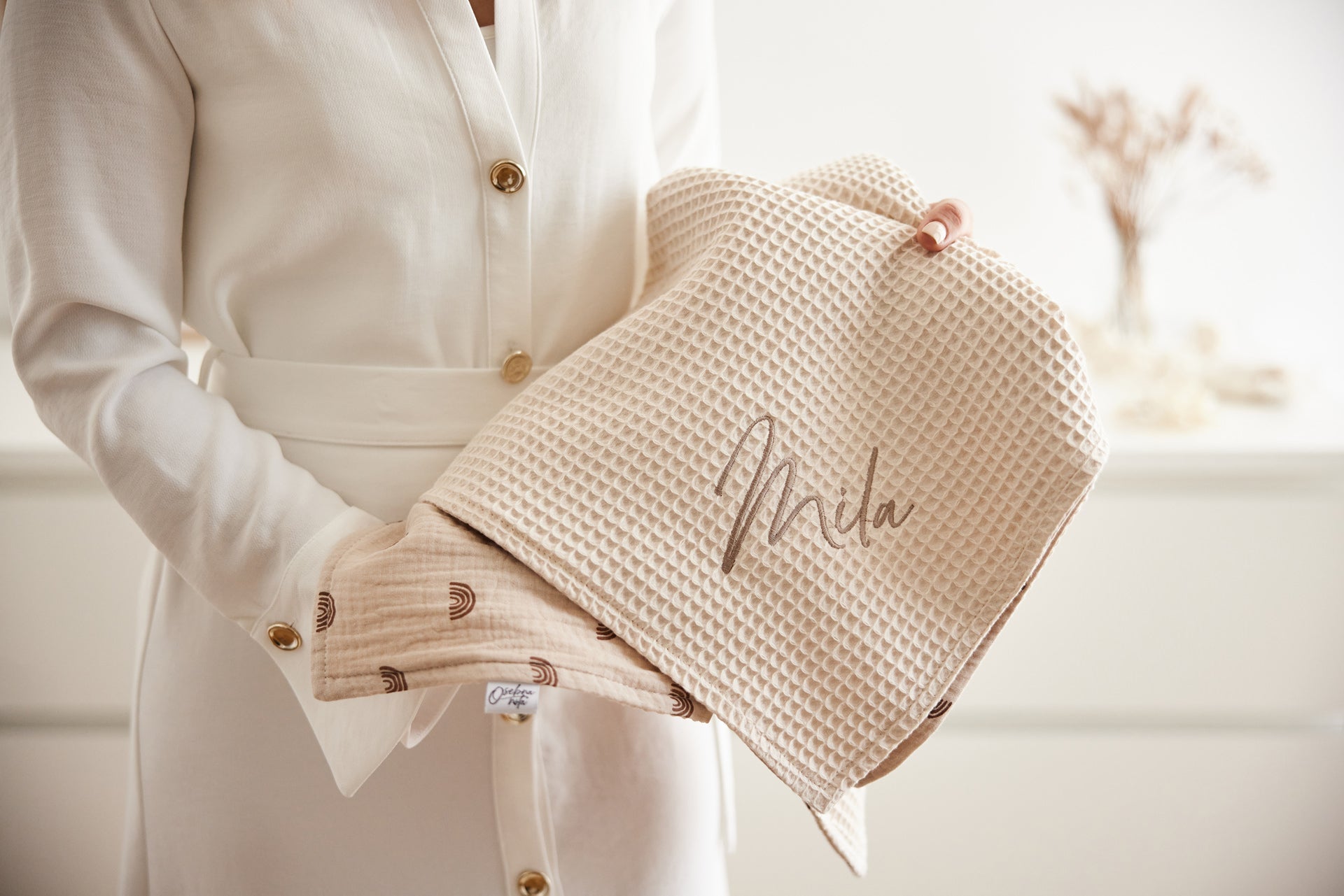 Neverjetno mehka in lahkotna odejica, narejena iz vafel (100 % bombažne) tkanine. Idealna za sprehode v vozičku pomladi ali poleti, da bo dojenčku ravno prav zračno in toplo.